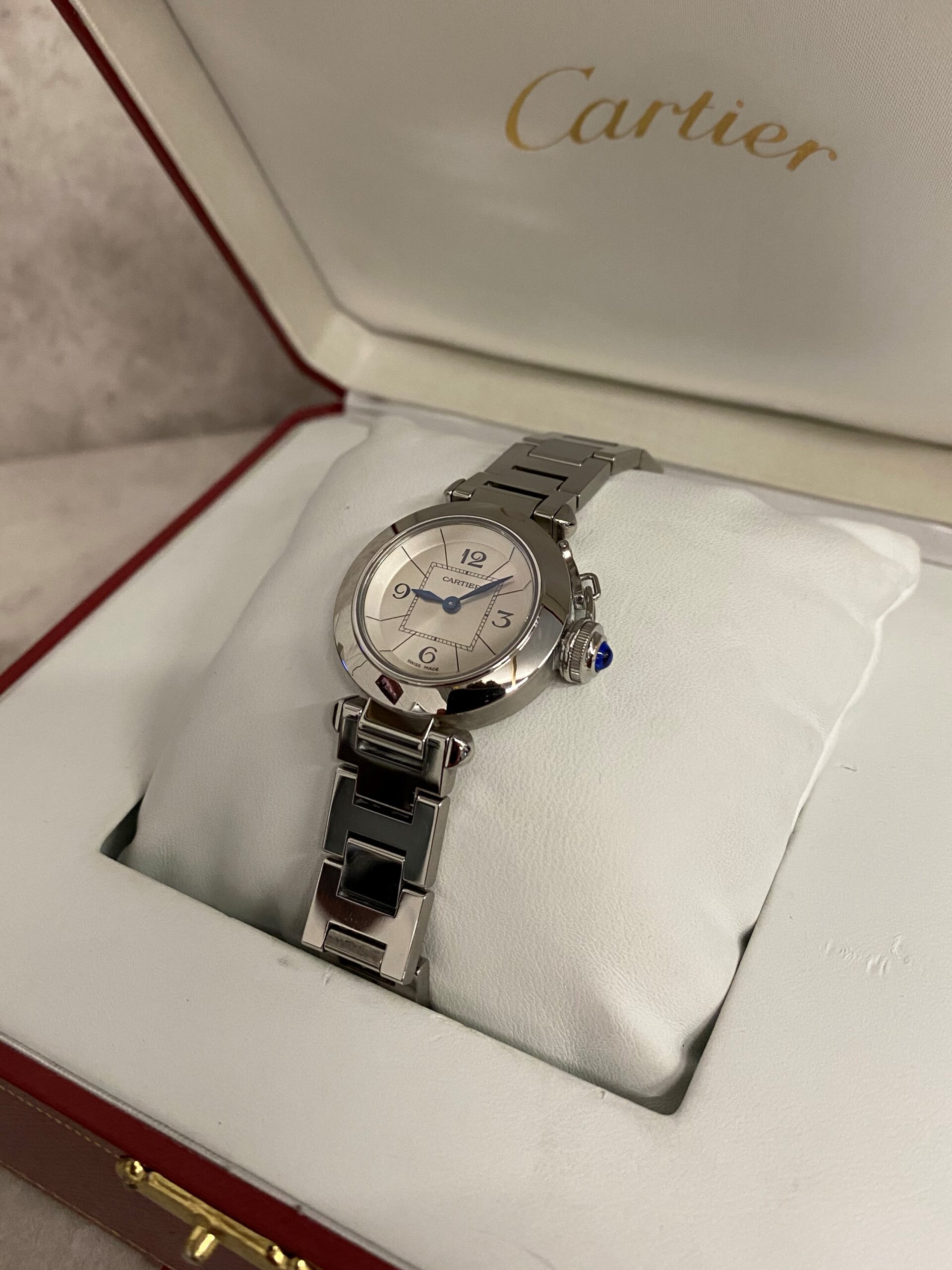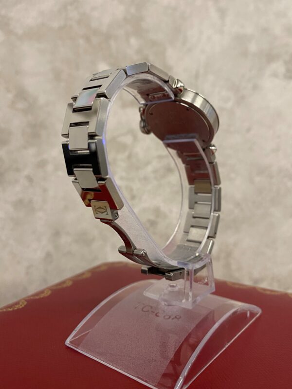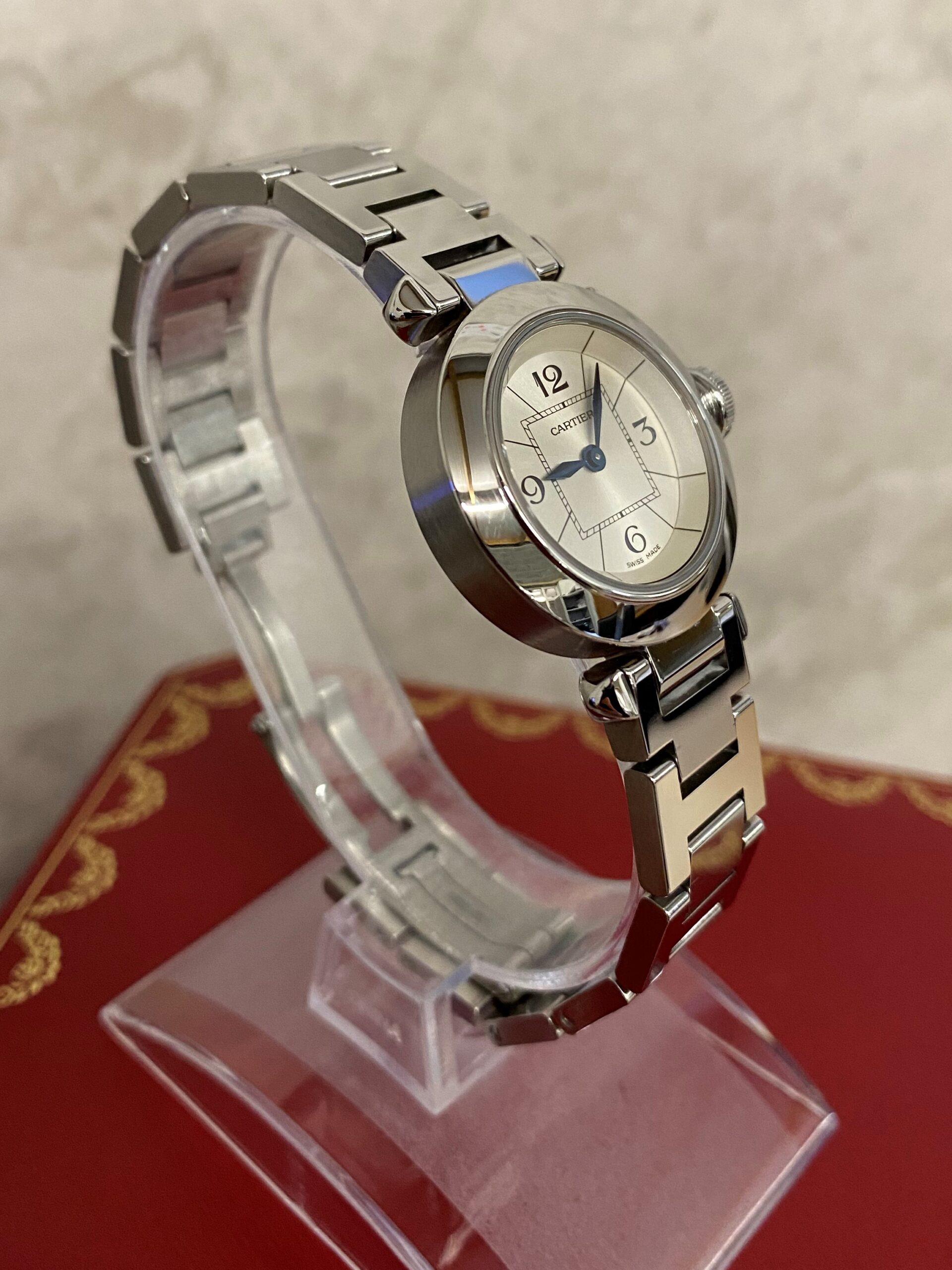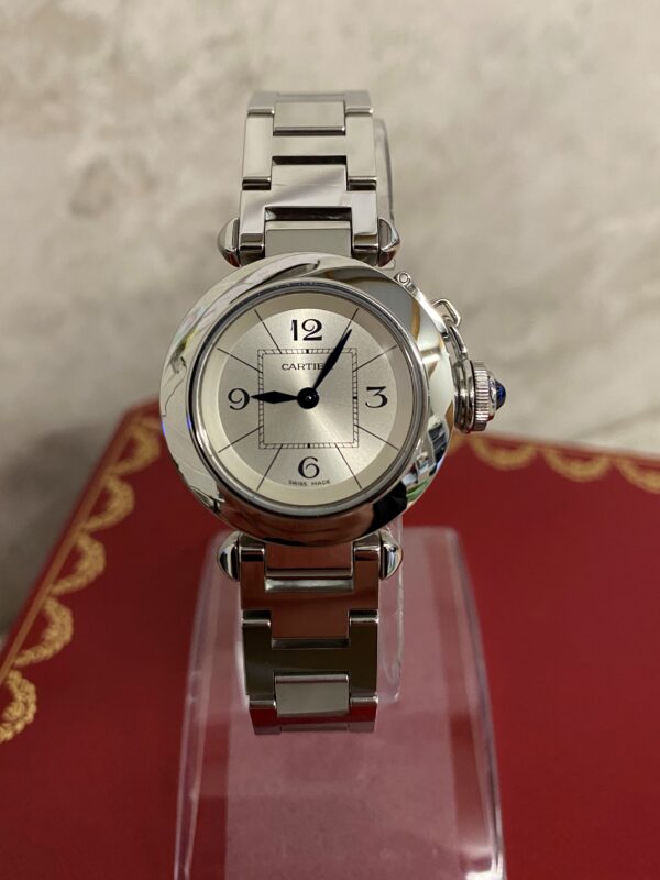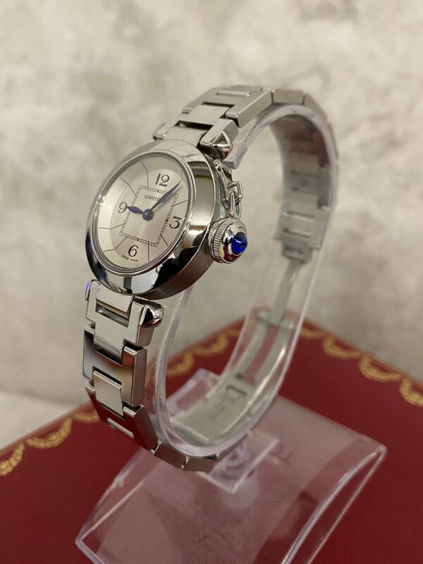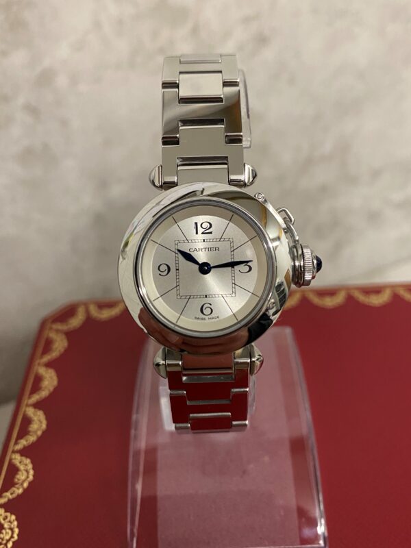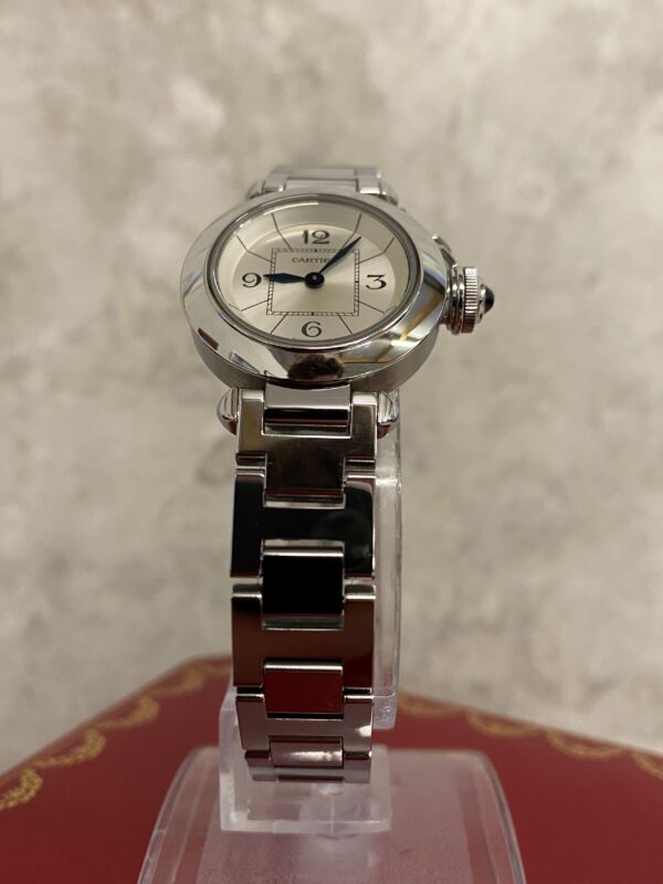 This Cartier Miss Pasha W3140007 Stainless Steel Bracelet (wrist size: 6.50 inches) Stainless Steel Bezel (case size: 27.00) Silver Dial women watch is in NEAR NEW CONDITION. The watch has a(n) Quartz movement. The crystal is Sapphire.