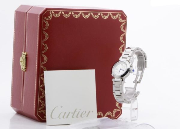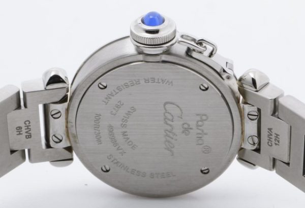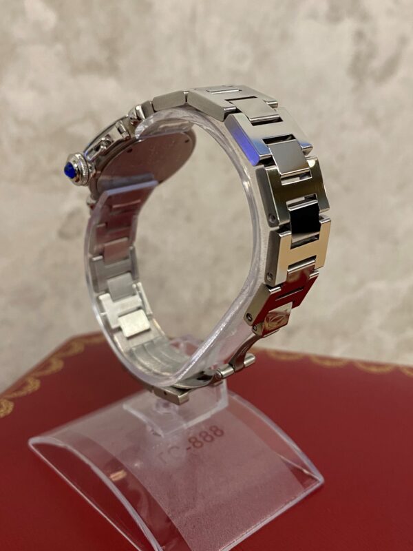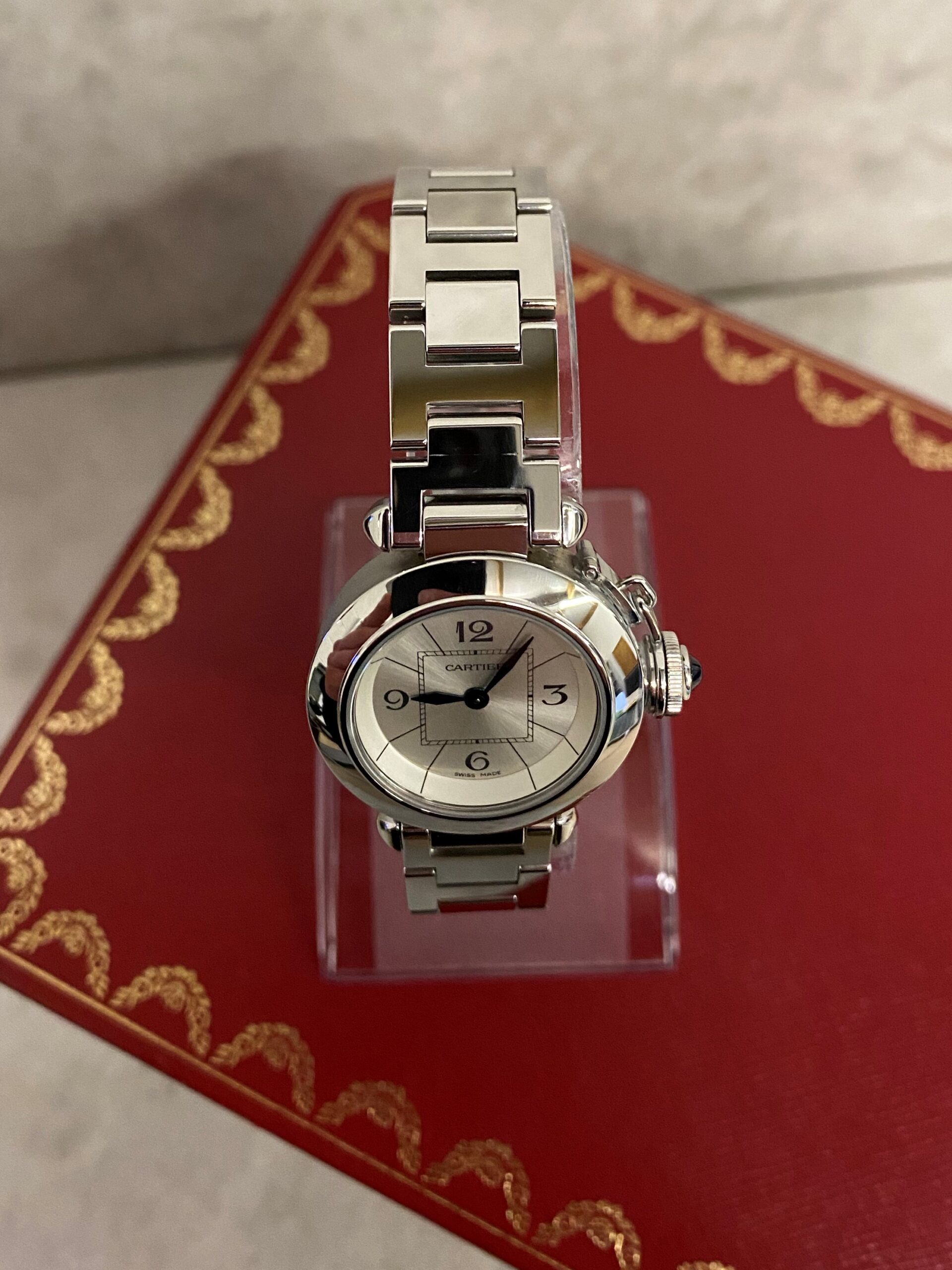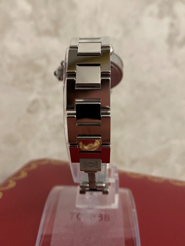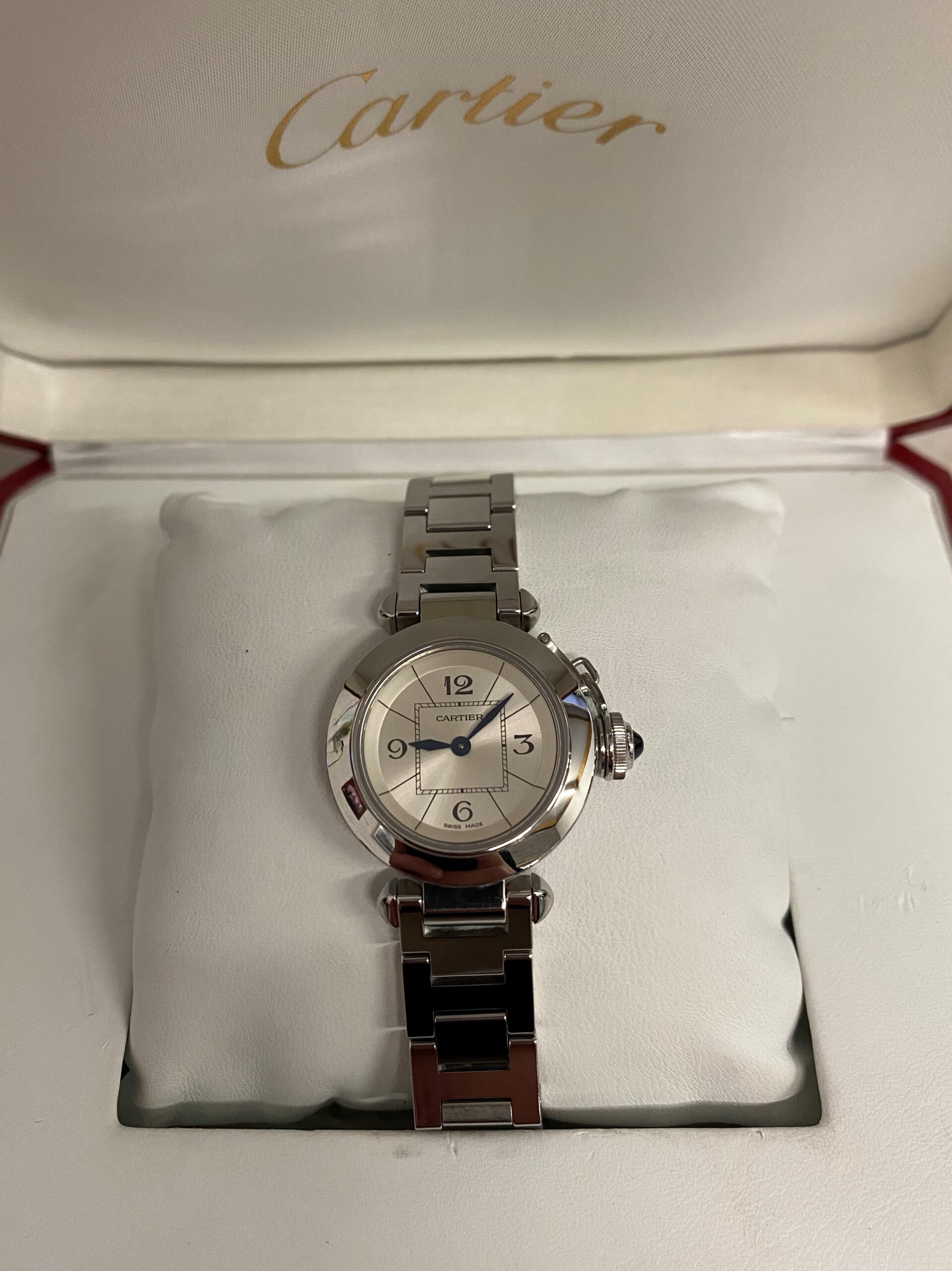 This Cartier Miss Pasha W3140007 Stainless Steel Bracelet (wrist size: 6.50 inches) Stainless Steel Bezel (case size: 27.00) Silver Dial women watch is in NEAR NEW CONDITION. The watch has a(n) Quartz movement. The crystal is Sapphire.