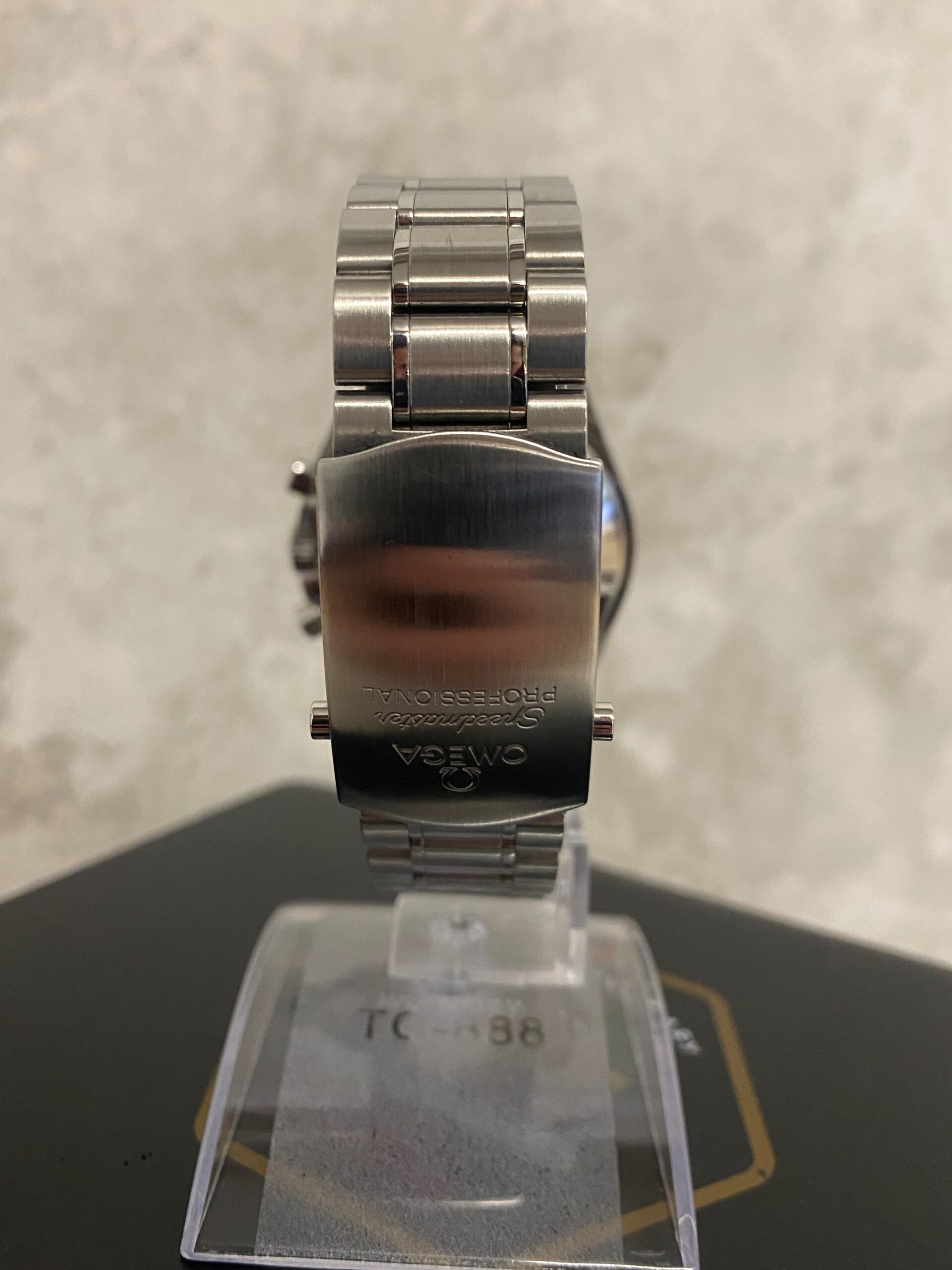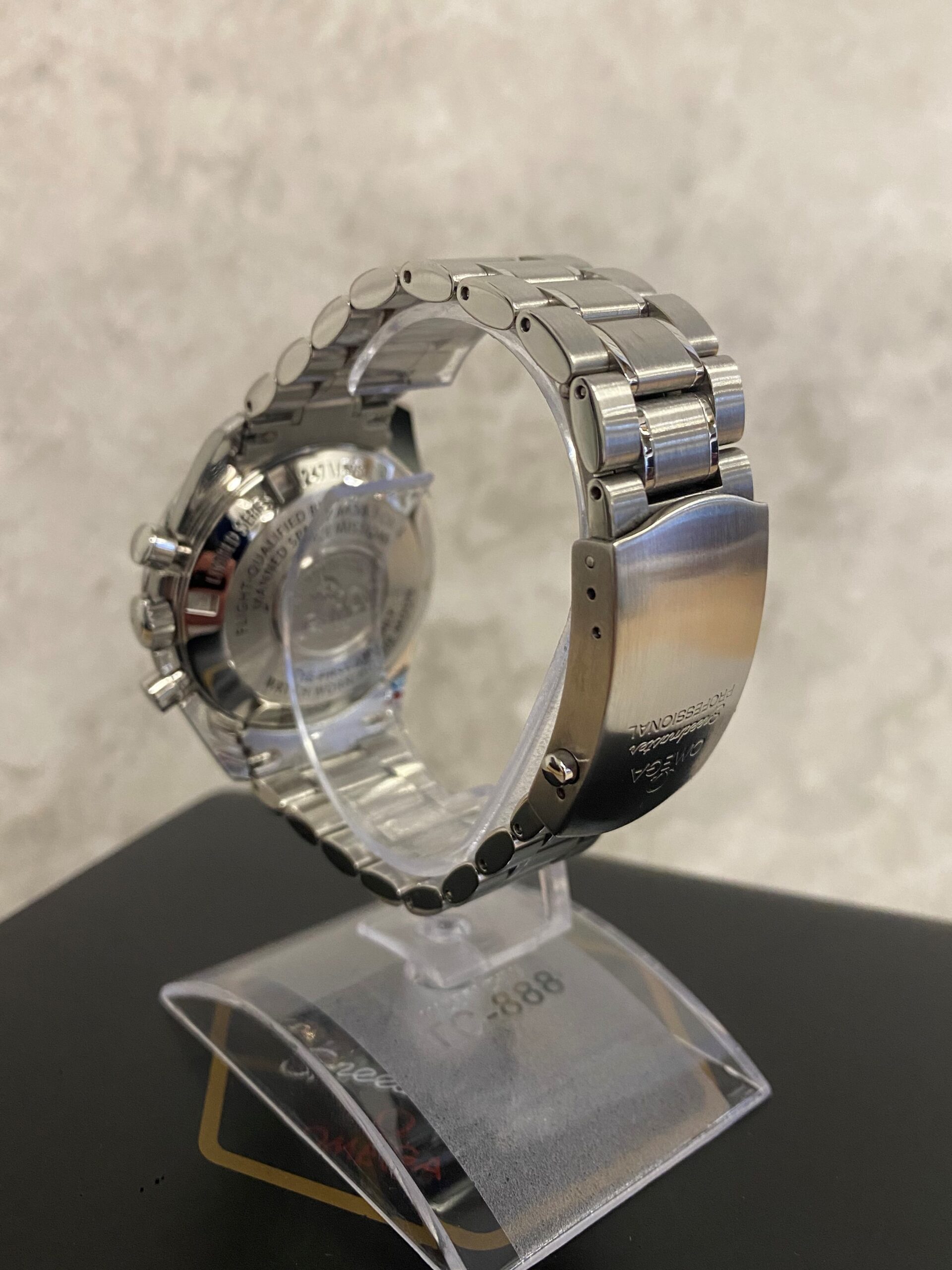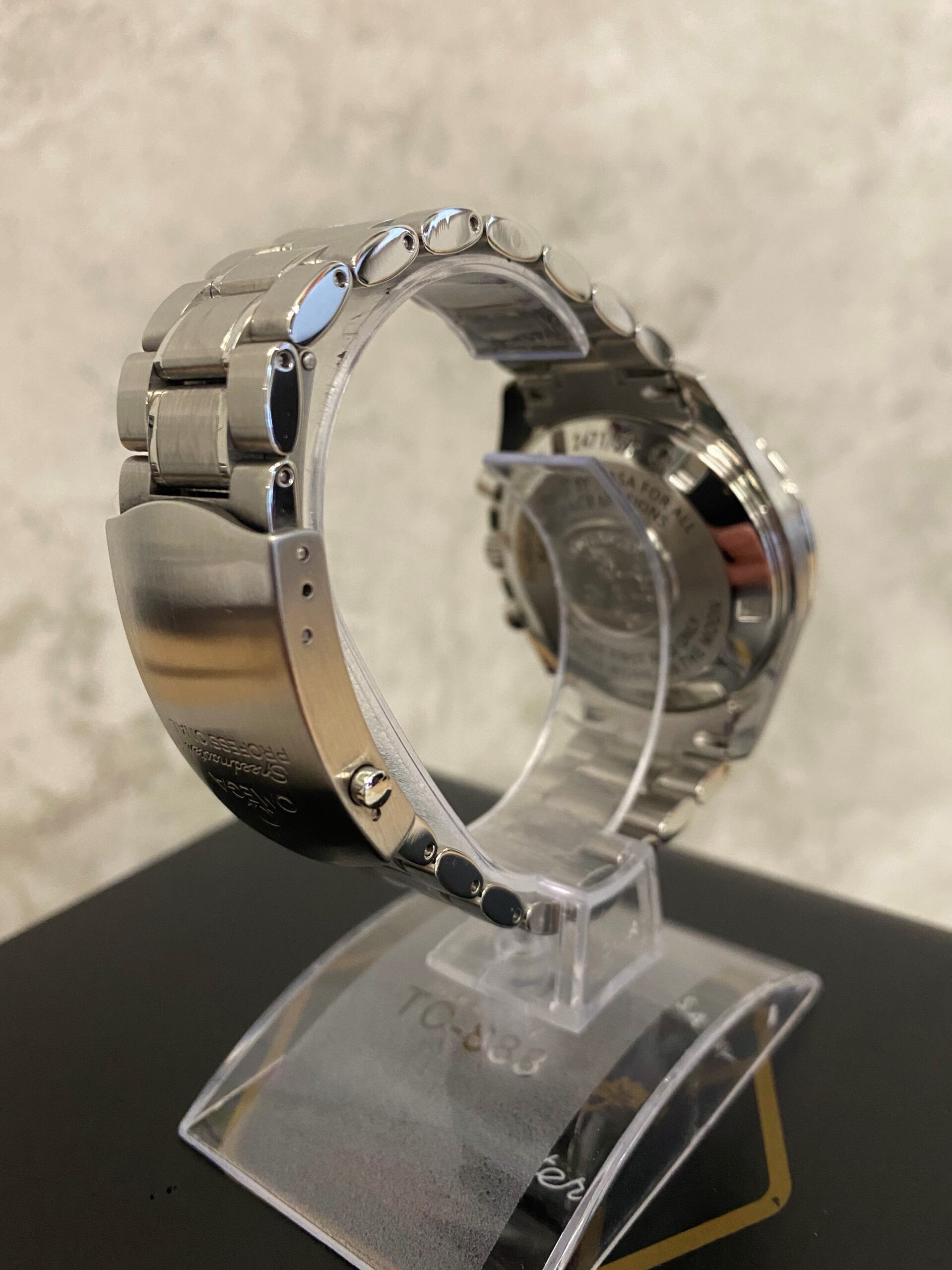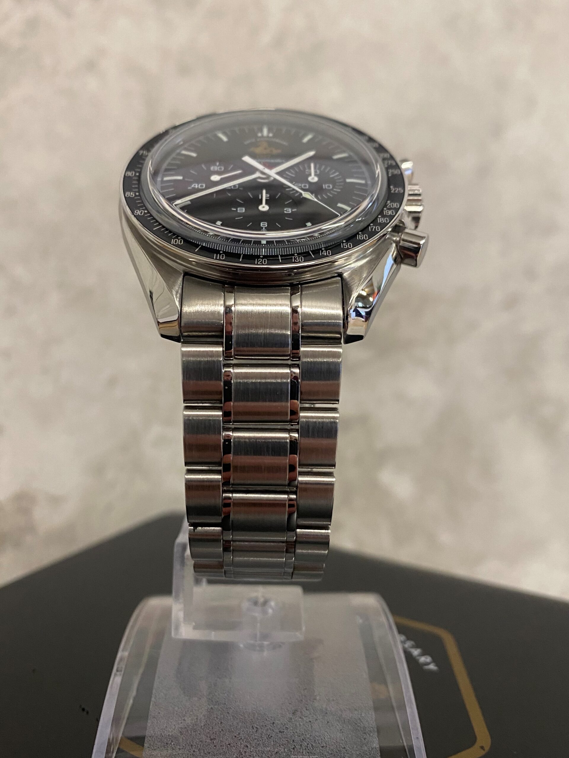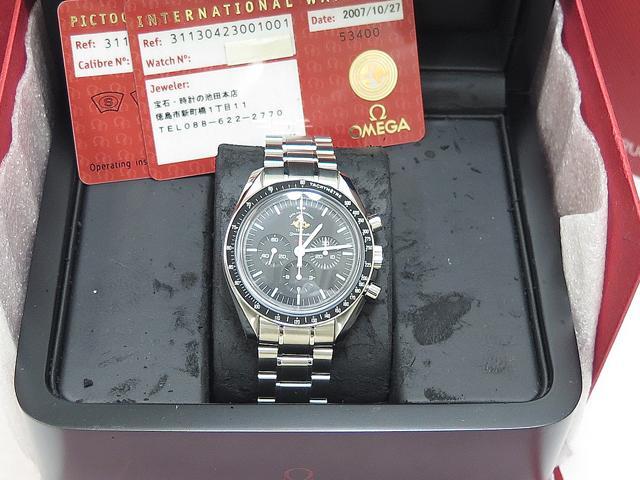 This particular watch is on a stainless steel Omega Speedmaster bracelet and comes with its original box (worn inside), operating instructions and warranty card manufactured by Omega in 2007.