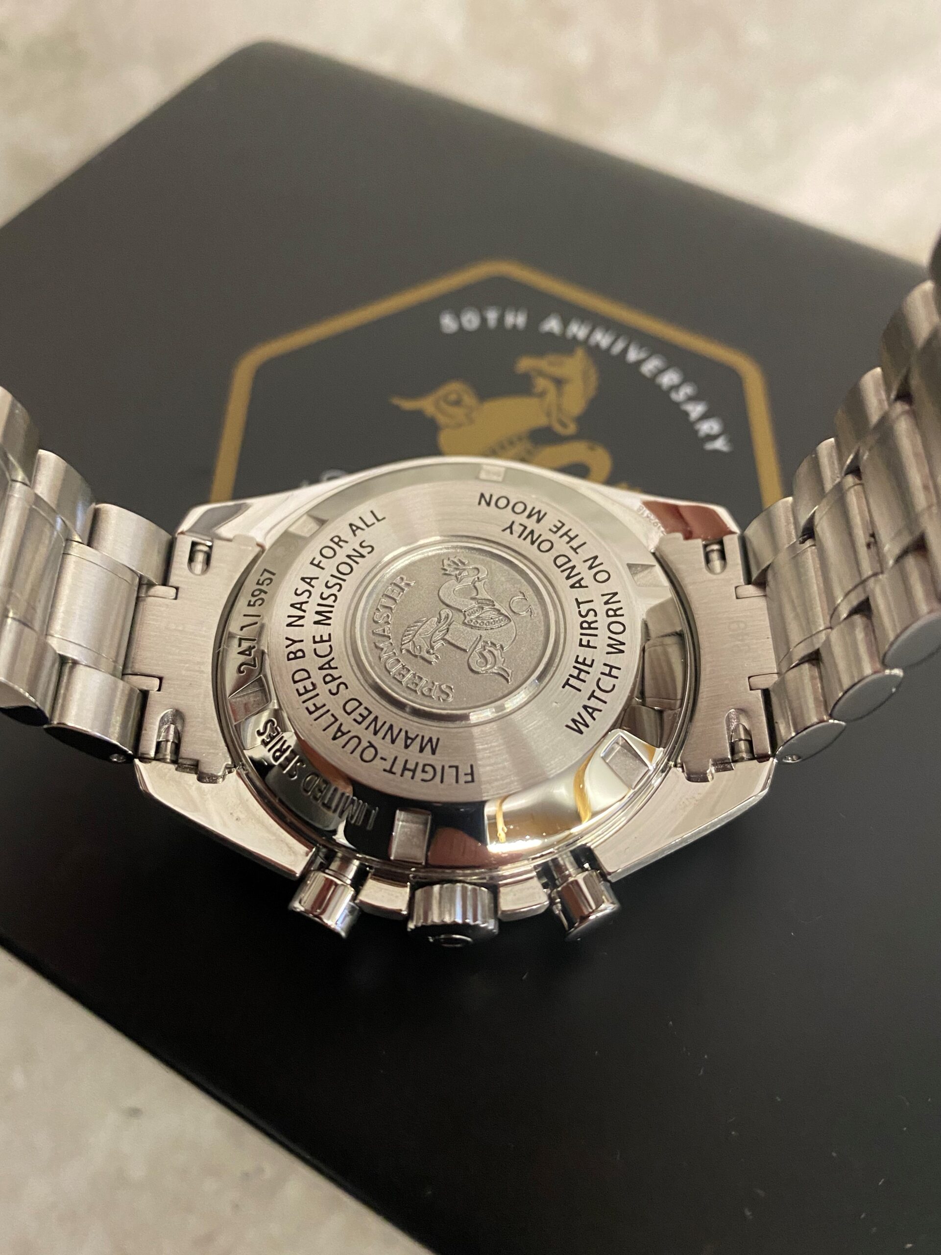 To celebrate its half-century of life, the words ‘50th Anniversary’ crown the golden seahorse featured at 12 o’clock on the dial. The hour and minutes hands, the central chronograph seconds hand and baton indexes have been highlighted with Super-LumiNova for maximum legibility in any conditions -on earth or in space. Although the original 1957 Speedmaster featured the iconic “Broad Arrow” hands, these were replaced in 1963 with “Dauphine” hands. Being slimmer, they create more space on the dial for a clearer view of the three counters with 12 hour, 30 minute and 60 second totalisers that proved vital on the Apollo 13 mission. As a tribute to its space legacy, the hands on this watch are white, just like those on the Apollo 11 mission to the Moon. The Arabic numerals on the counters and on the characteristic black aluminium tachymeter scale on the bezel have been designed with maximum clarity and legibility in mind. A scratch-resistant sapphire crystal with anti-reflective treatment protects the dial of this Limited Series Moonwatch.
