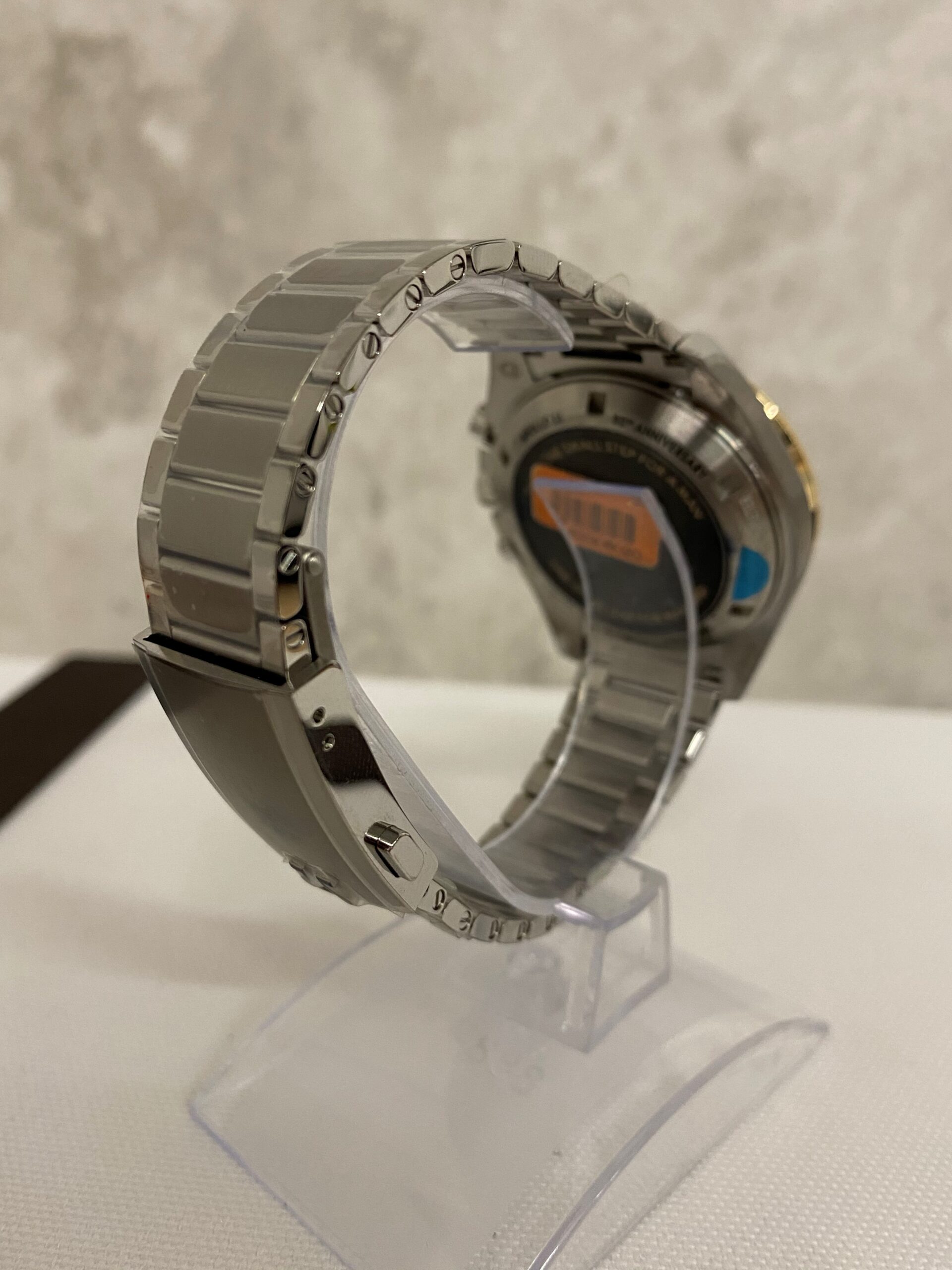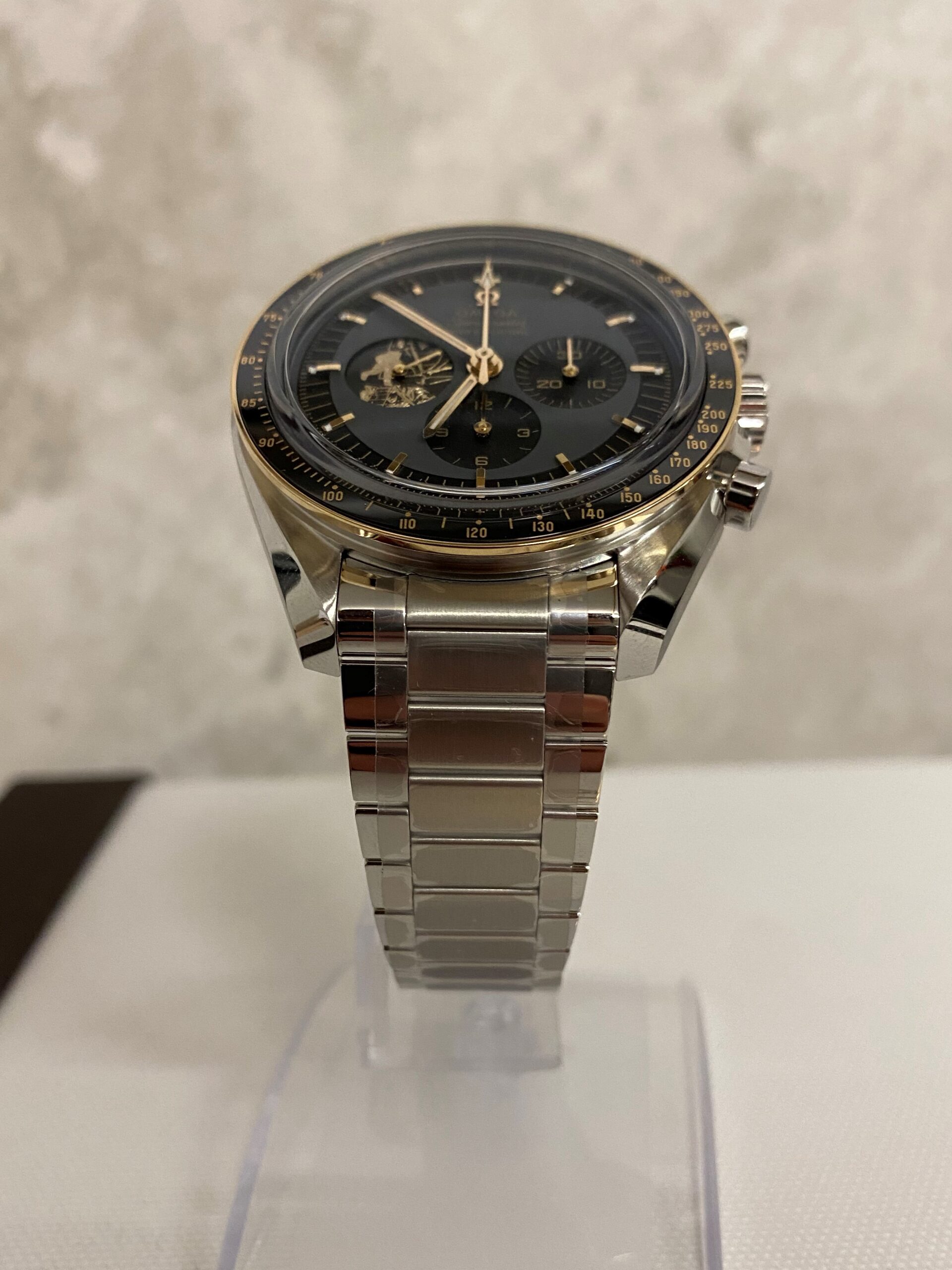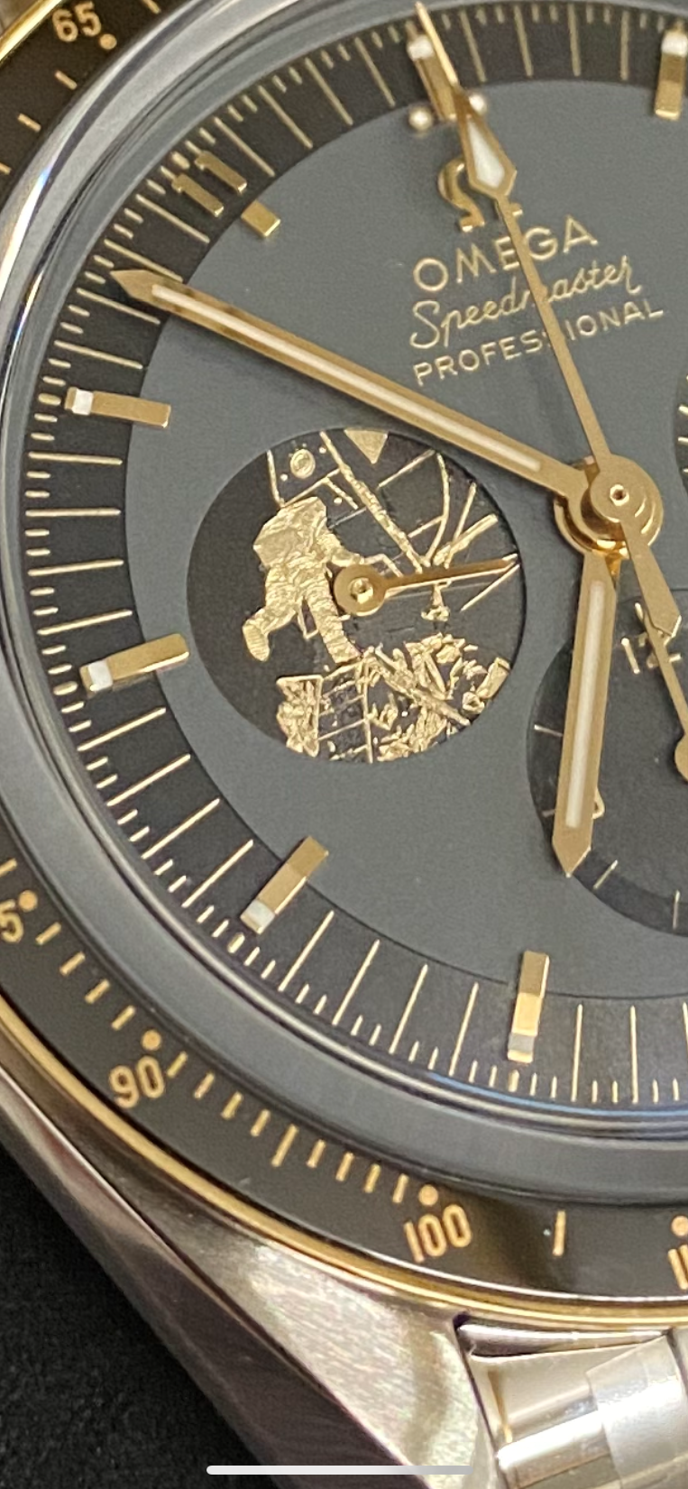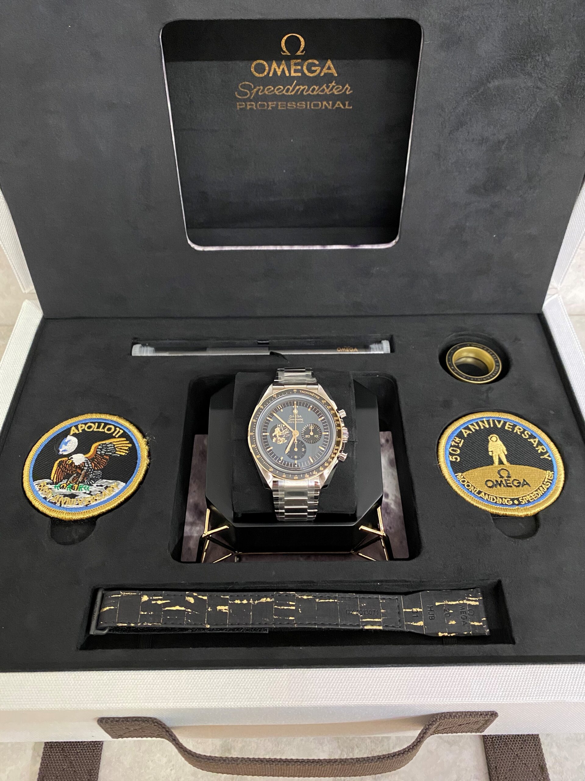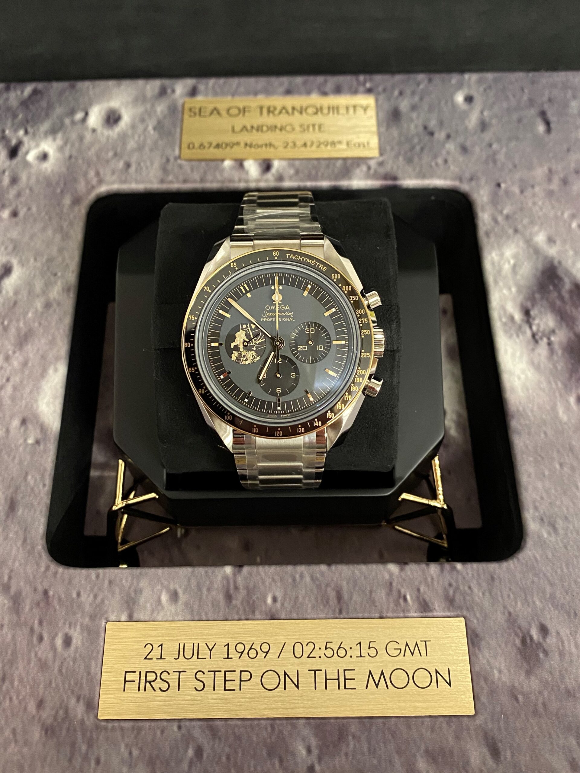 The watch includes a 42 mm case in stainless steel with a polished 18K Moonshine Gold bezel. The bezel ring is polished black ceramic [ZrO2] with an OMEGA Ceragold tachymeter scale. There is a varnished grey and black dial with all indexes and hands in 18K Moonshine Gold – except the central chronograph seconds hand, which is PVD-coated in Moonshine Gold. A unique hour marker is positioned at 11 o’clock, and there is a distinctive 9 o’clock subdial in 18K Moonshine Gold with a laser-engraved image of Buzz Aldrin climbing down onto the lunar surface.
