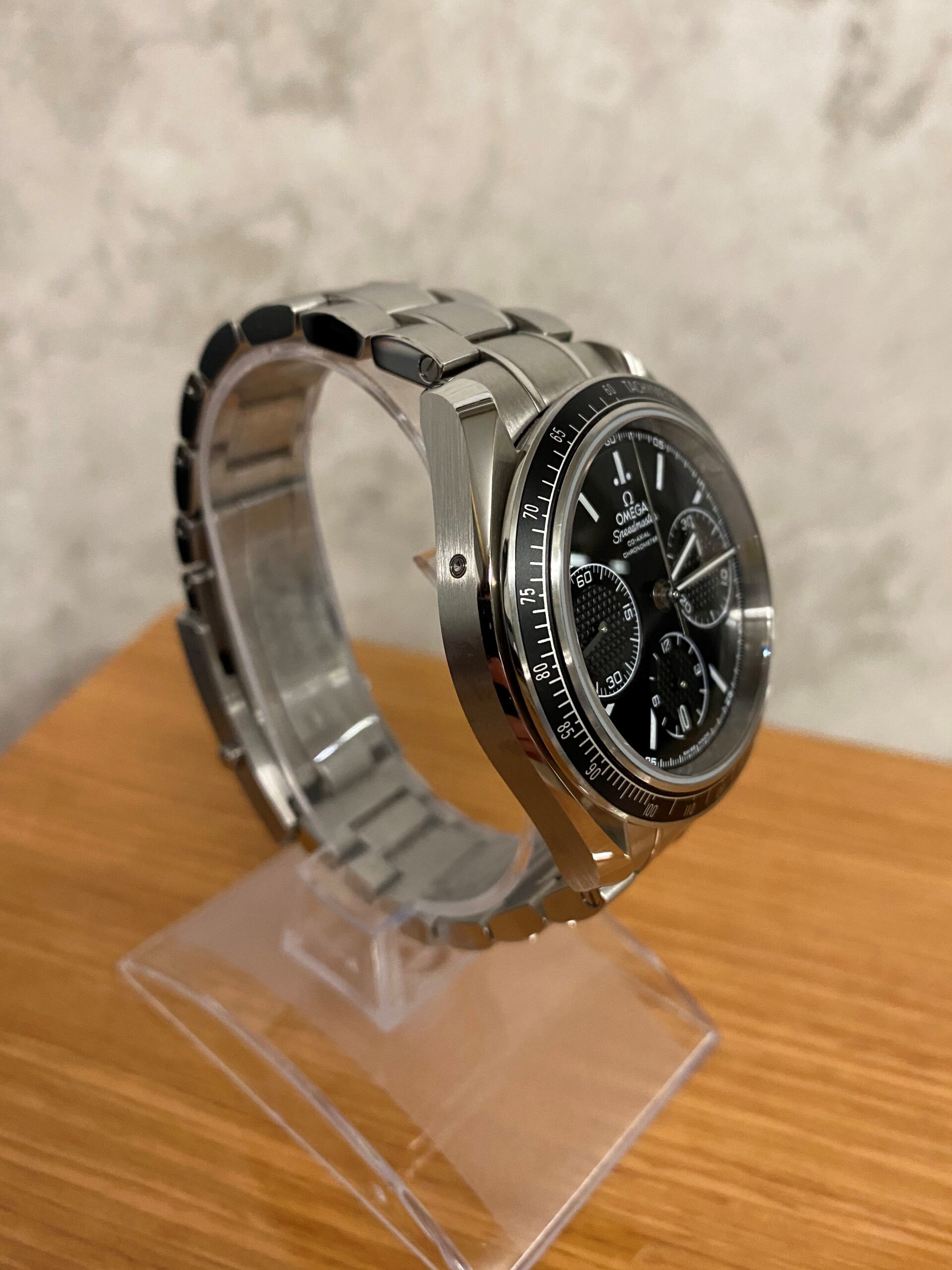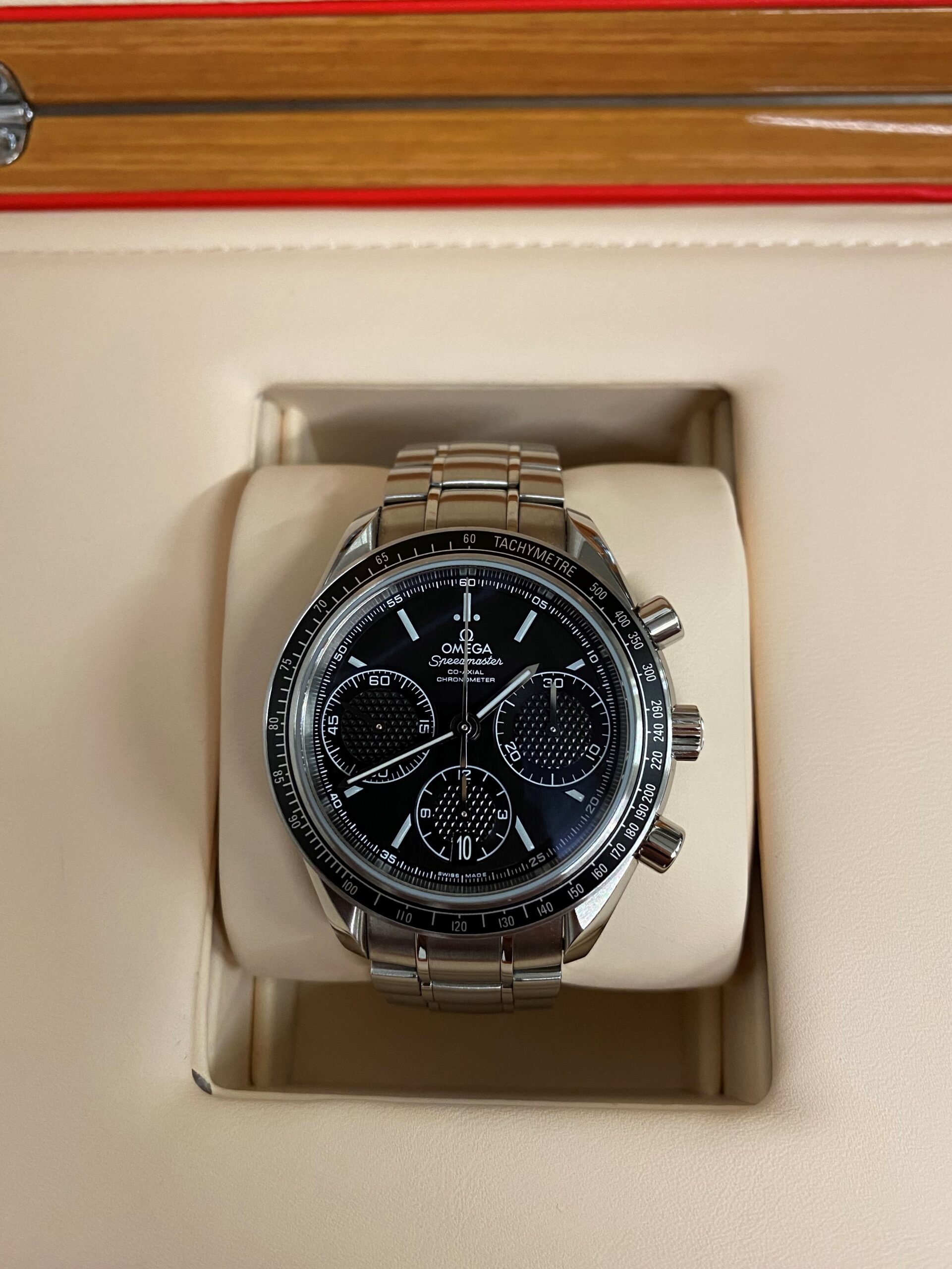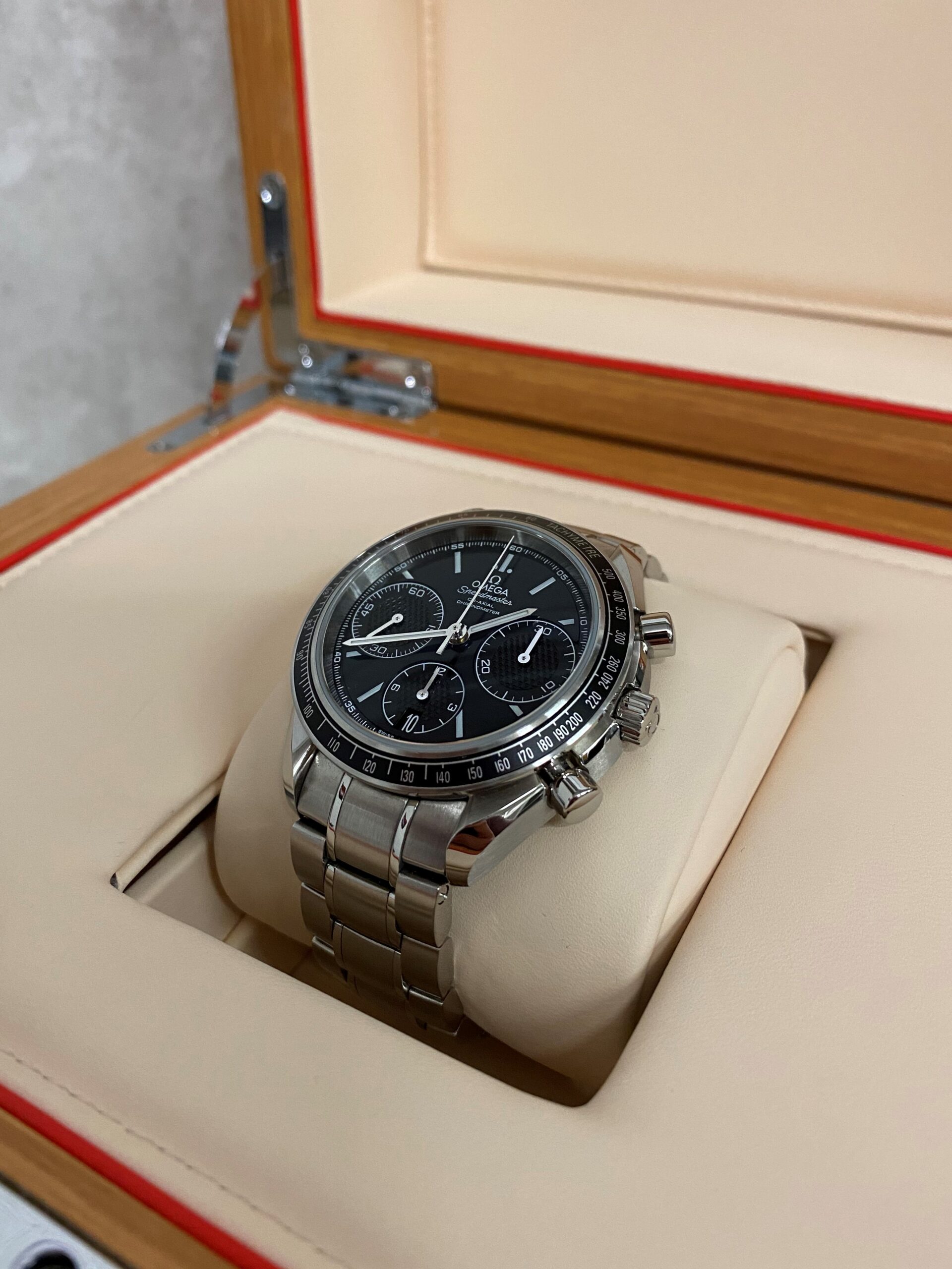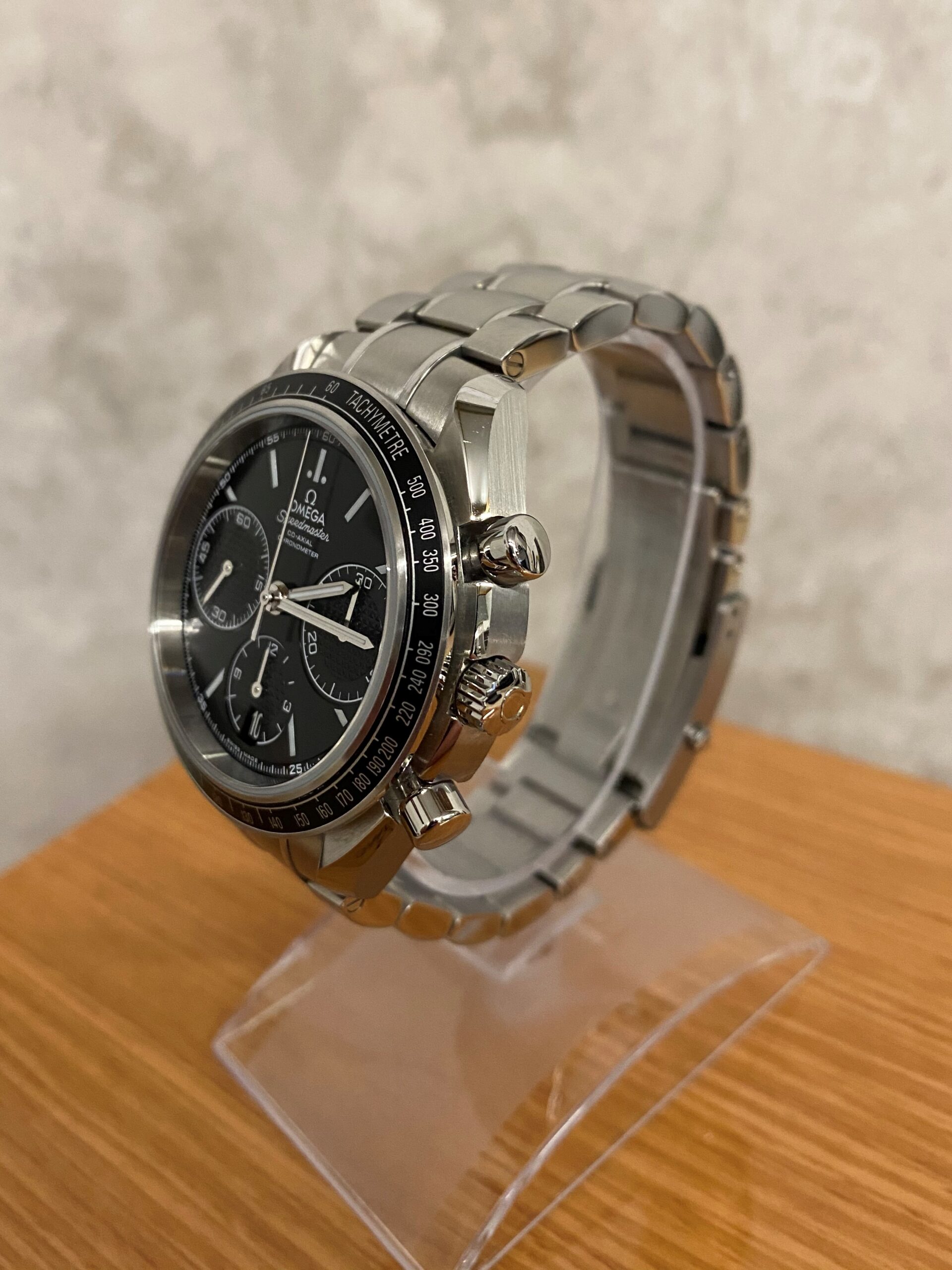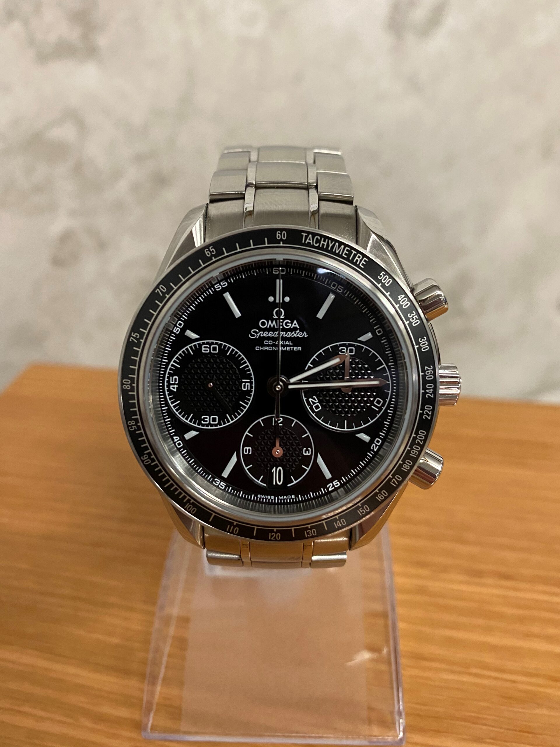 Stainless steel case with a stainless steel bracelet. Fixed stainless steel bezel with black aluminium top ring showing tachymeter markings. Black dial with luminous silver-tone hands and index hour markers. Minute markers around the outer rim. Dial Type: Analog. Luminescent hands and markers. Date display at the 6 o’clock position. Chronograph – three sub-dials displaying: 60 second, 30 minute and 12 hour. Omega calibre 3330 automatic movement with a 52-hour power reserve. Scratch resistant sapphire crystal. Pull / push crown. Solid case back. Case size: 40 mm. Case thickness: 15 mm. Round case shape. Band width: 19 mm. Band length: 8.5 inches. Deployment clasp with a push button release. Water resistant at 100 meters / 330 feet. Functions: chronograph, date, hour, minute, second, chronometer, tachymeter. Luxury watch style. Watch label: Swiss Made.