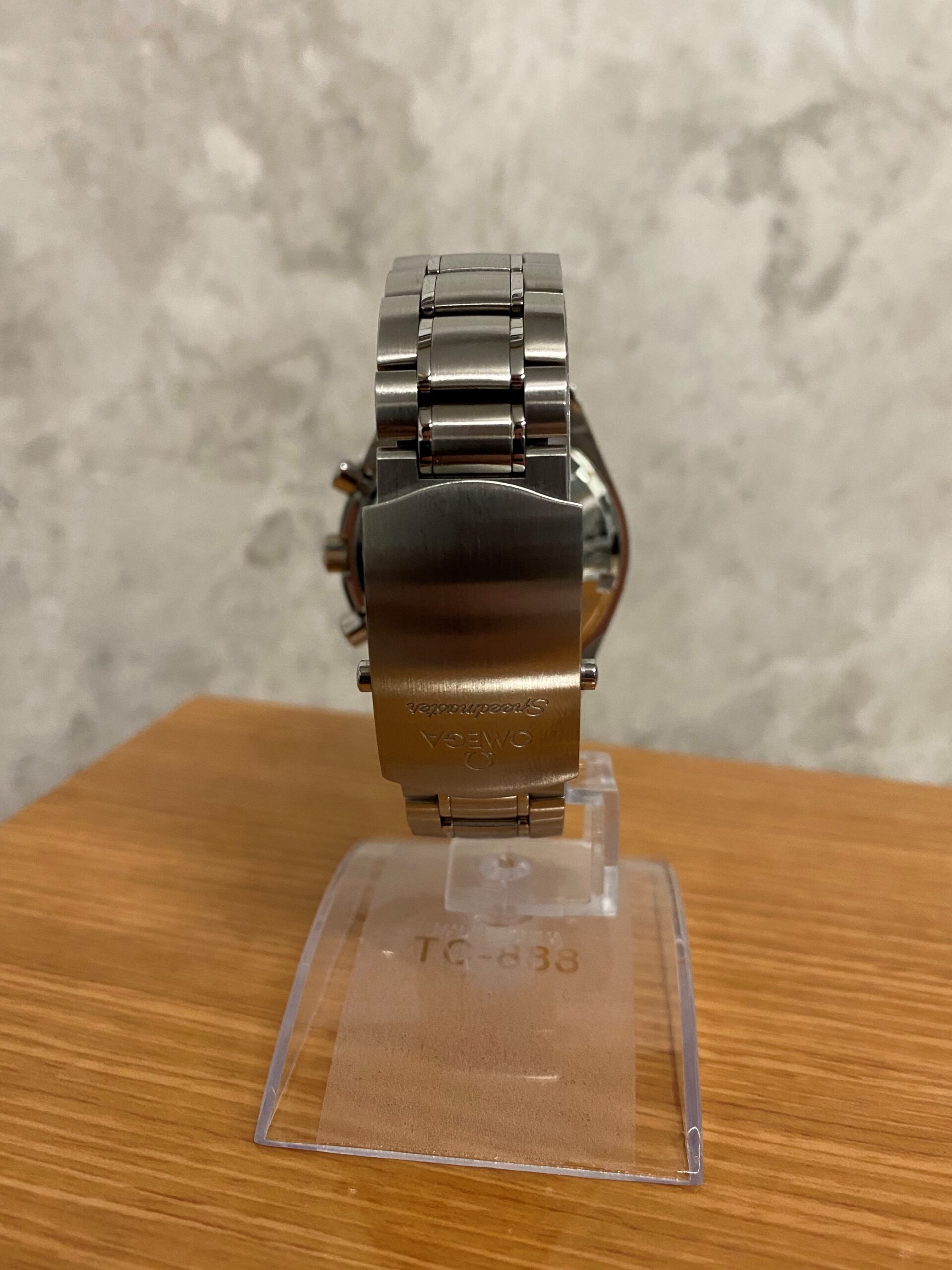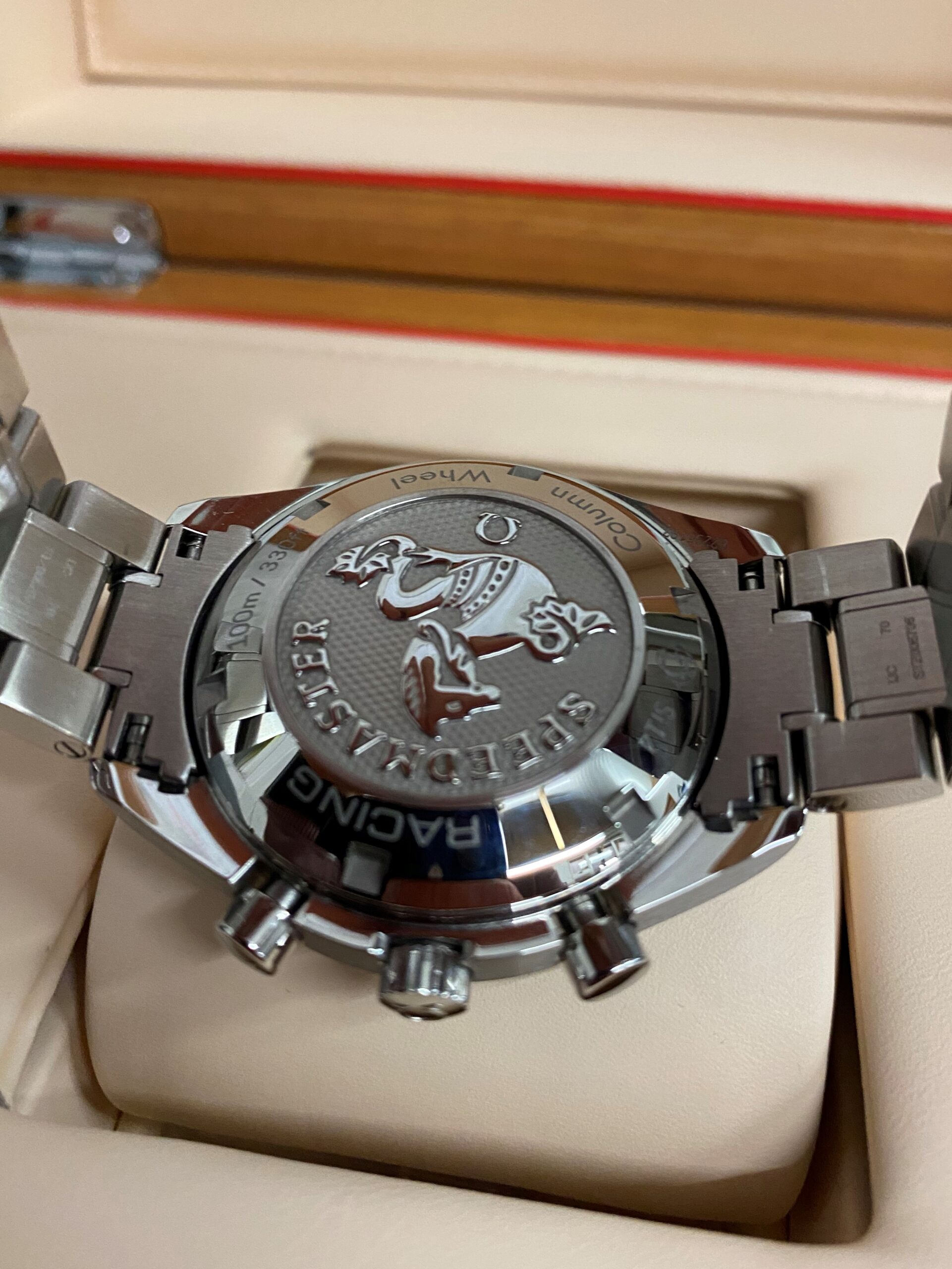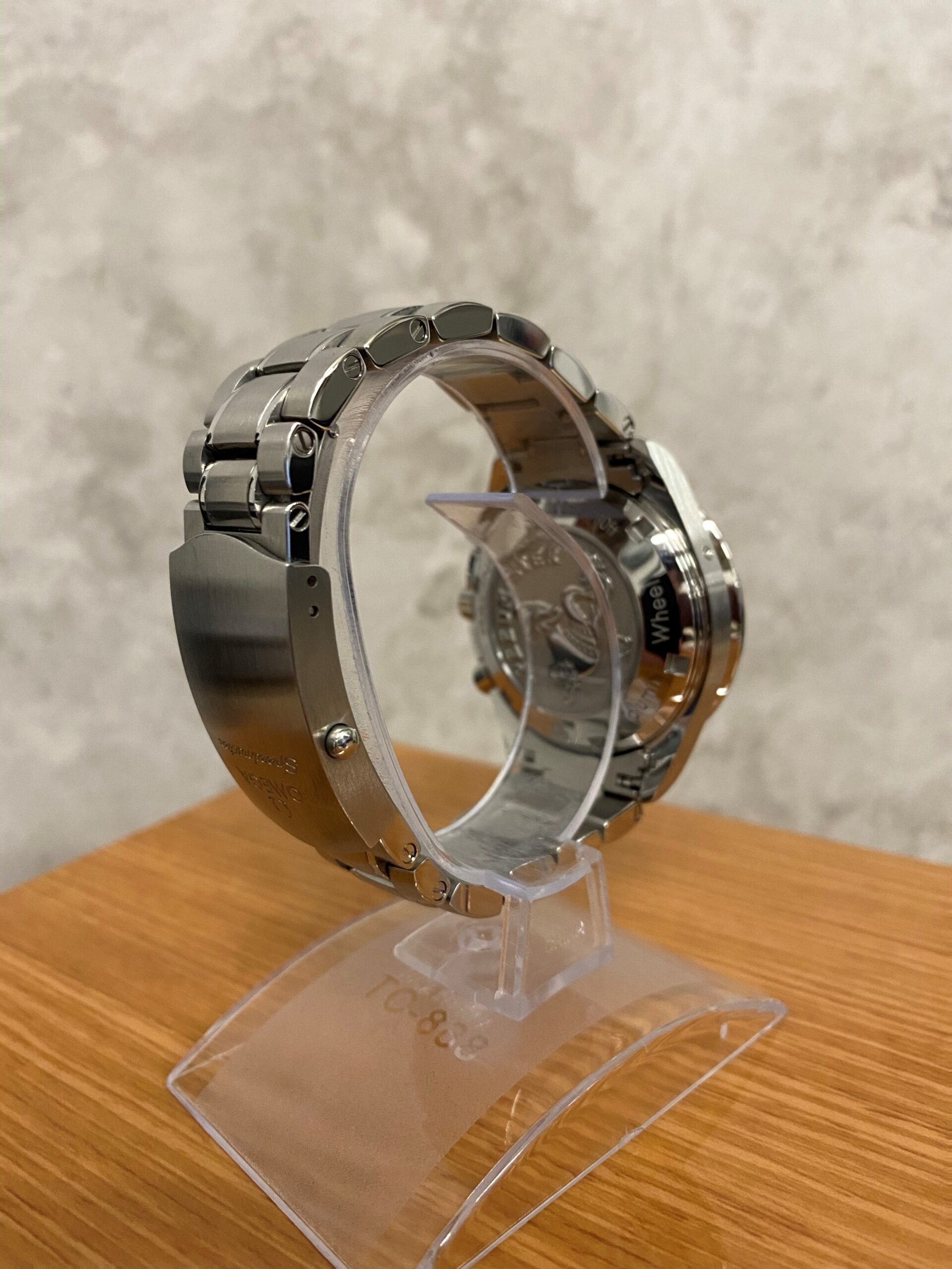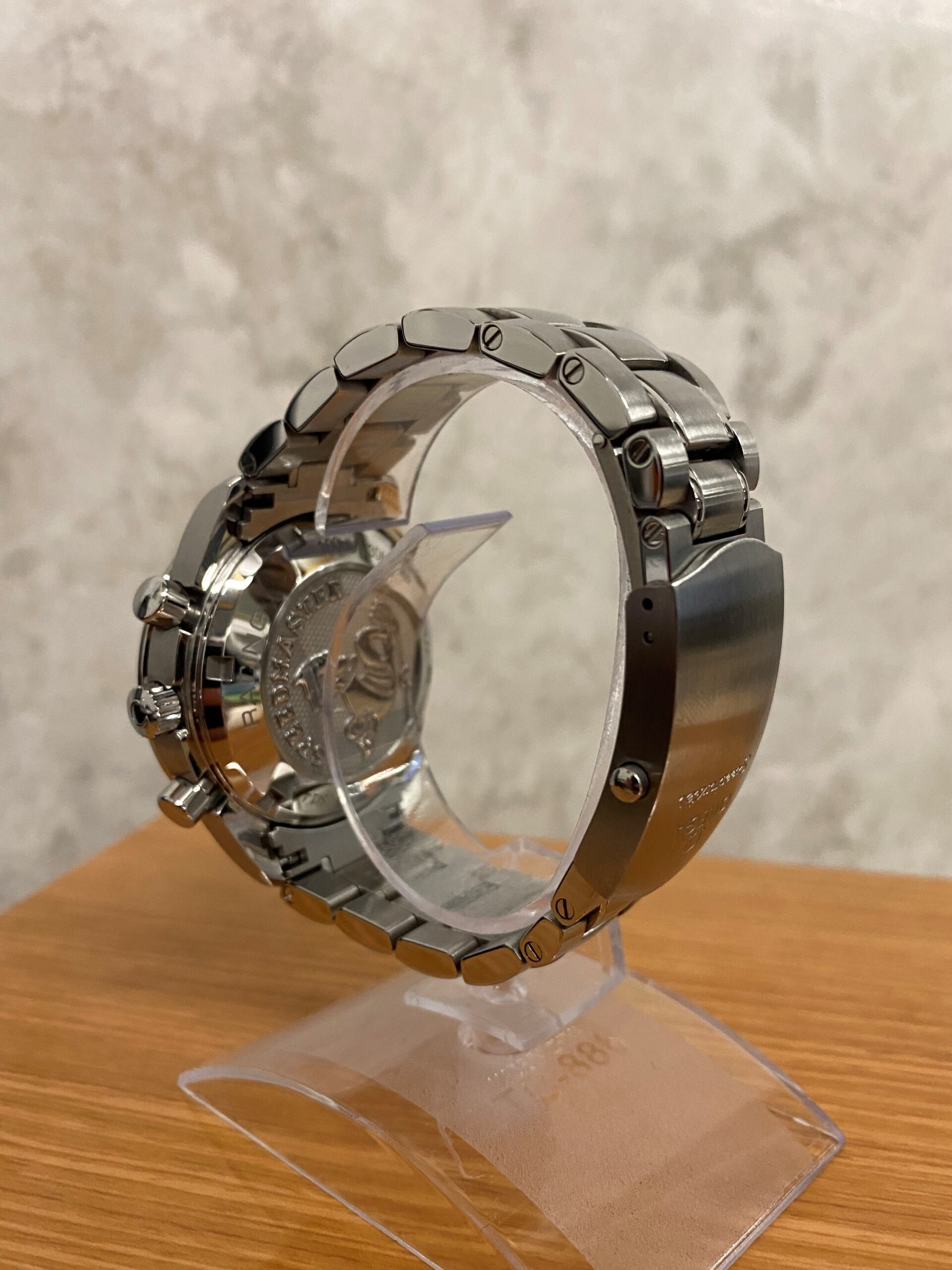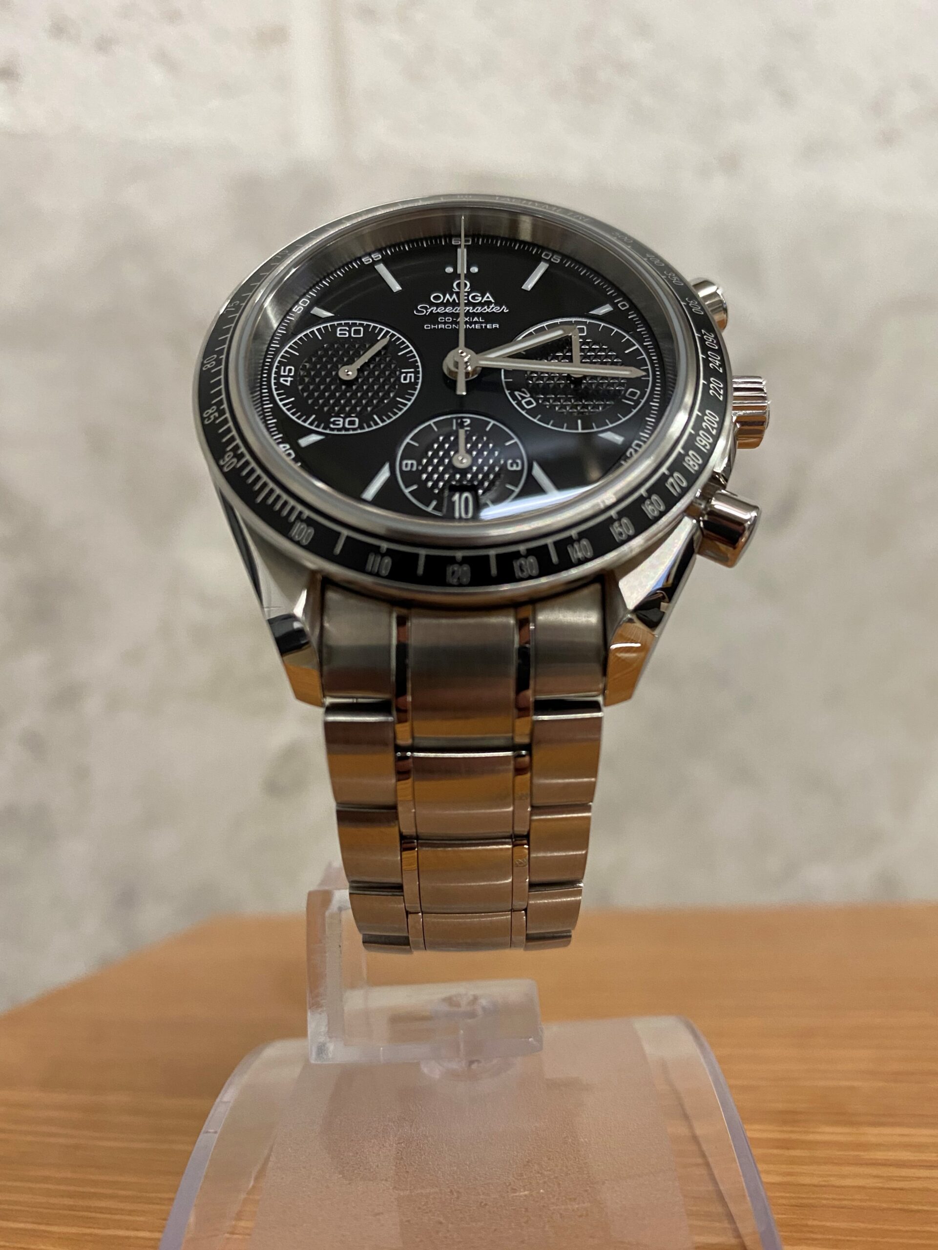 Stainless steel case with a stainless steel bracelet. Fixed stainless steel bezel with black aluminium top ring showing tachymeter markings. Black dial with luminous silver-tone hands and index hour markers. Minute markers around the outer rim. Dial Type: Analog. Luminescent hands and markers. Date display at the 6 o’clock position. Chronograph – three sub-dials displaying: 60 second, 30 minute and 12 hour. Omega calibre 3330 automatic movement with a 52-hour power reserve. Scratch resistant sapphire crystal. Pull / push crown. Solid case back. Case size: 40 mm. Case thickness: 15 mm. Round case shape. Band width: 19 mm. Band length: 8.5 inches. Deployment clasp with a push button release. Water resistant at 100 meters / 330 feet. Functions: chronograph, date, hour, minute, second, chronometer, tachymeter. Luxury watch style. Watch label: Swiss Made.