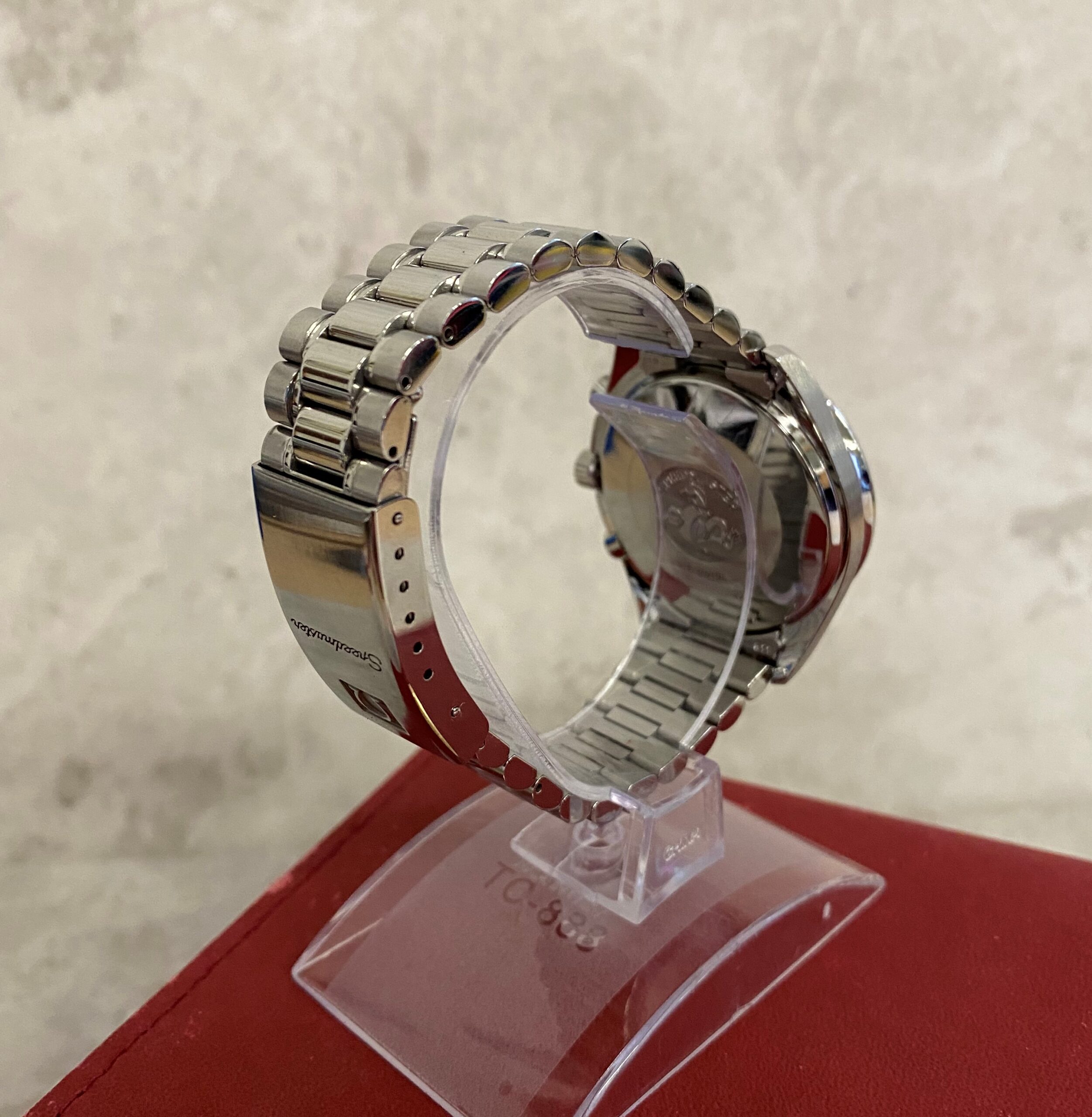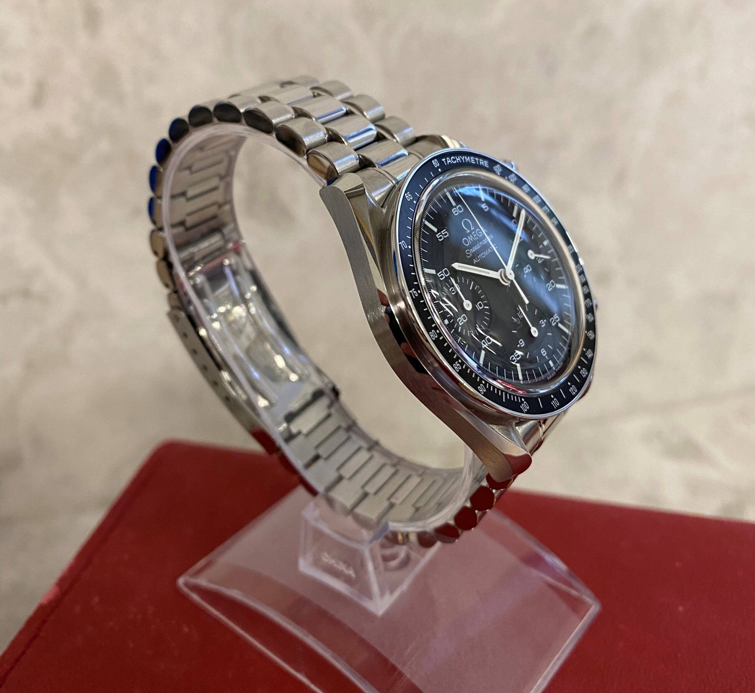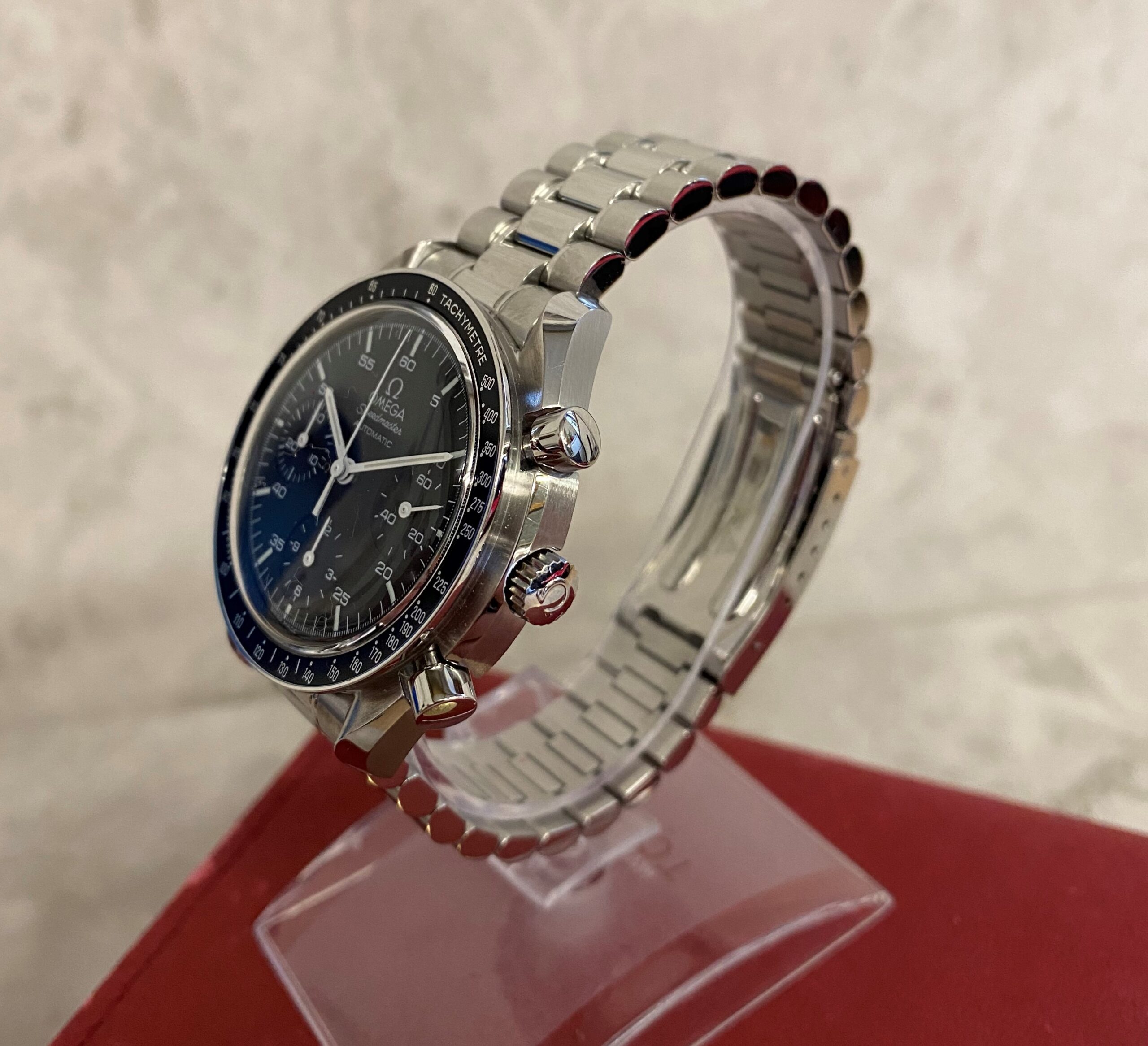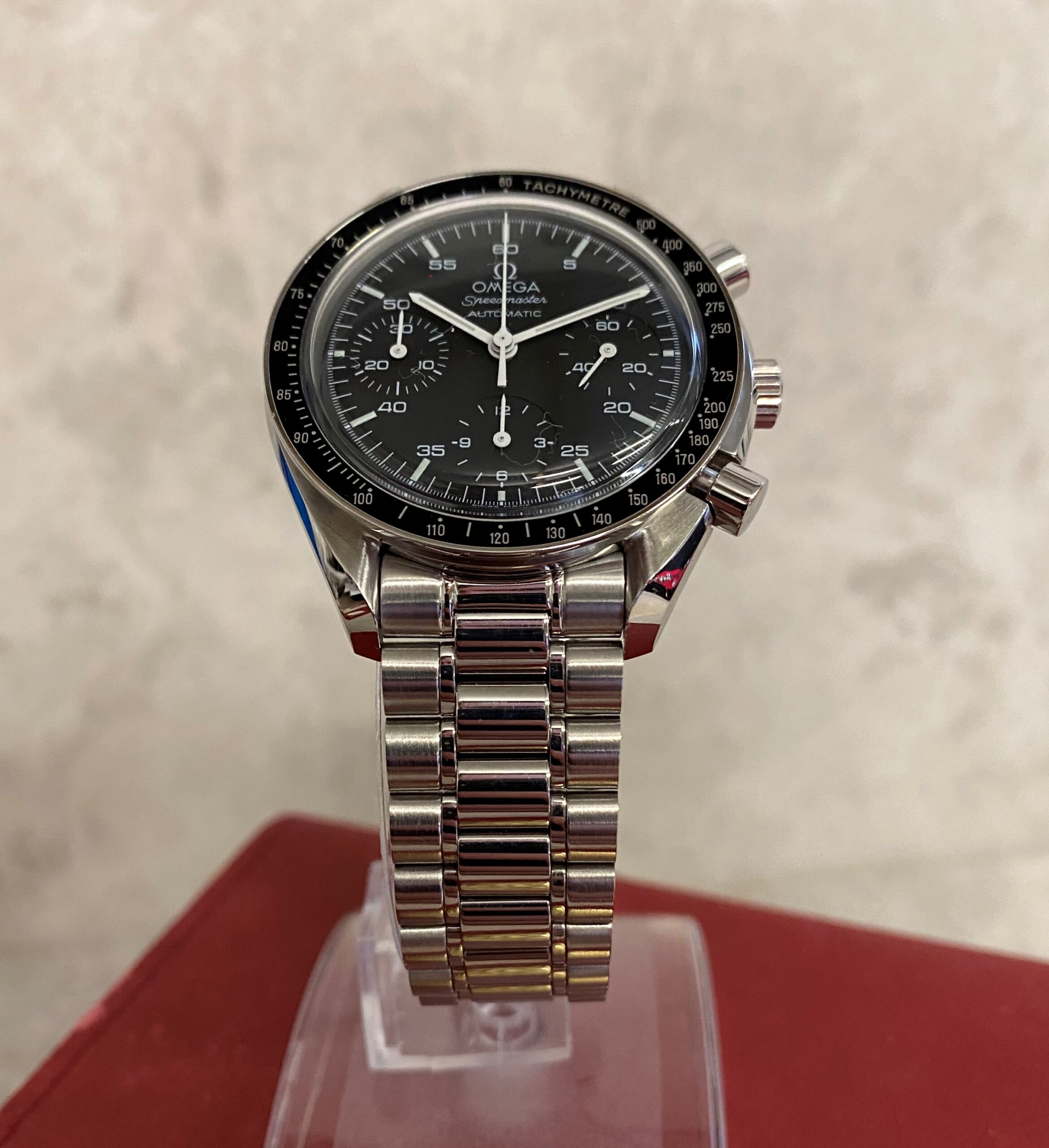 The Omega Speedmaster is one of the most iconic chronograph models ever made. Famously, it was a Speedmaster Professional that Buzz Aldrin wore when he stepped onto the moon in 1969. The flat black bezel is calibrated for tachymeter and the steel case has flaring sides with combinations of polished and satin finishes. The stainless steel bracelet is detachable and this watch may be worn with a strap if preferred. Named the ‘Reduced’ Speedmaster this model has a slightly smaller case diameter of 39mm rather than the 42mm diameter of the standard Speedmaster, it is also an automatic rather than manually wound version of the Speedmaster family.