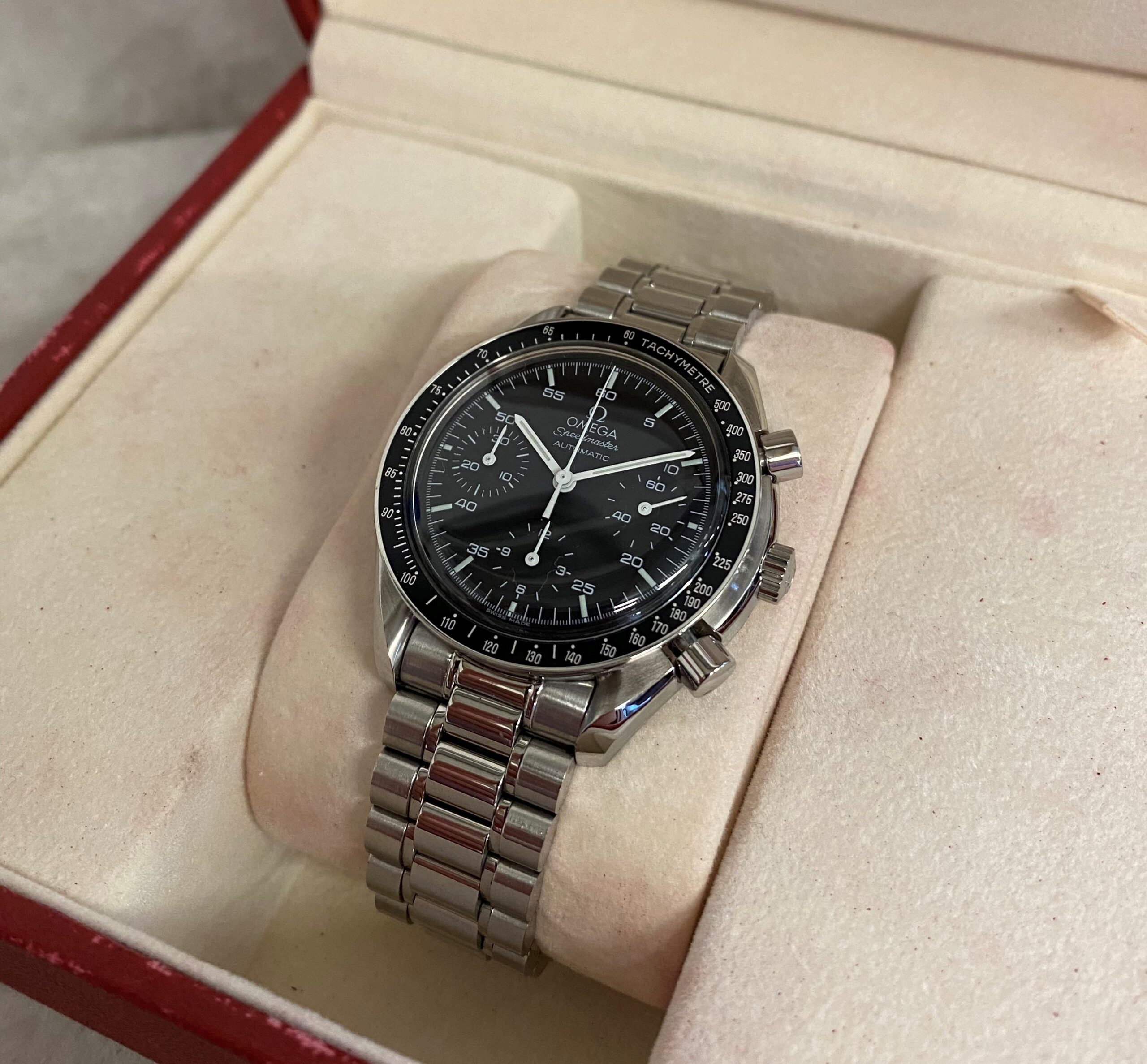 Omega calibre 3220 automatic movement, lever escapement, 47 jewels, mono-metallic balance, 28,800 BPH, Incabloc shock absorber [D] black dial, luminescent baton hour indexes with, Arabic 5-minute markers, outer white track for minutes & chronograph seconds, three subsidiary dials for constant seconds, 30-minute and 12-hour registers, luminescent baton hands, central chronograph seconds hand [C] stainless steel case with polished and satin finished flared lugs, black bezel calibrated for tachymeter, round chronograph pushers, press-in case back centre with embossed Speedmaster logo, Omega crown, Omega signed plexi-glass [B] detachable stainless steel bracelet with polished central links and satin finished side links, satin finished folding clasp [S] case, dial, movement, crown, crystal and bracelet signed.