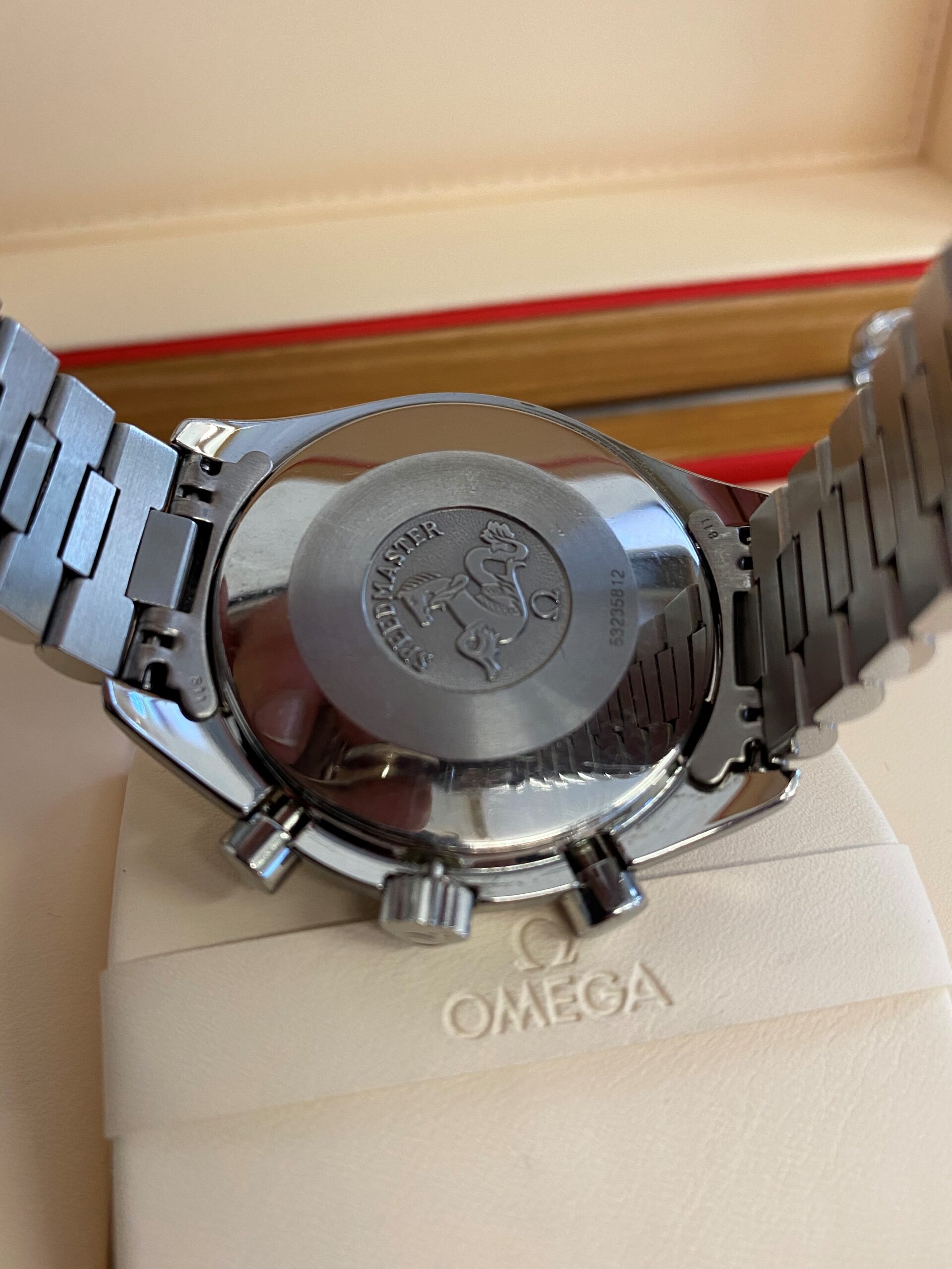 Omega calibre 3220 automatic movement, lever escapement, 47 jewels, mono-metallic balance, 28,800 BPH, Incabloc shock absorber [D] black dial, luminescent baton hour indexes with, Arabic 5-minute markers, outer white track for minutes & chronograph seconds, three subsidiary dials for constant seconds, 30-minute and 12-hour registers, luminescent baton hands, central chronograph seconds hand [C] stainless steel case with polished and satin finished flared lugs, black bezel calibrated for tachymeter, round chronograph pushers, press-in case back centre with embossed Speedmaster logo, Omega crown, Omega signed plexi-glass [B] detachable stainless steel bracelet with polished central links and satin finished side links, satin finished folding clasp [S] case, dial, movement, crown, crystal and bracelet signed.