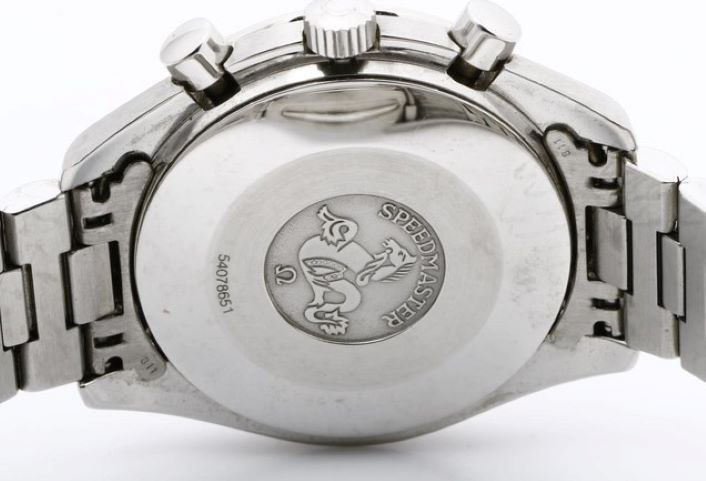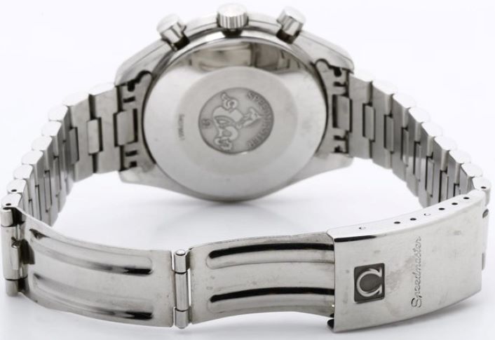Omega calibre 3220 automatic movement, lever escapement, 47 jewels, mono-metallic balance, 28,800 BPH, Incabloc shock absorber [D] black dial, luminescent baton hour indexes with, Arabic 5-minute markers, outer white track for minutes & chronograph seconds, three subsidiary dials for constant seconds, 30-minute and 12-hour registers, luminescent baton hands, central chronograph seconds hand [C] stainless steel case with polished and satin finished flared lugs, black bezel calibrated for tachymeter, round chronograph pushers, press-in case back centre with embossed Speedmaster logo, Omega crown, Omega signed plexi-glass [B] detachable stainless steel bracelet with polished central links and satin finished side links, satin finished folding clasp [S] case, dial, movement, crown, crystal and bracelet signed.