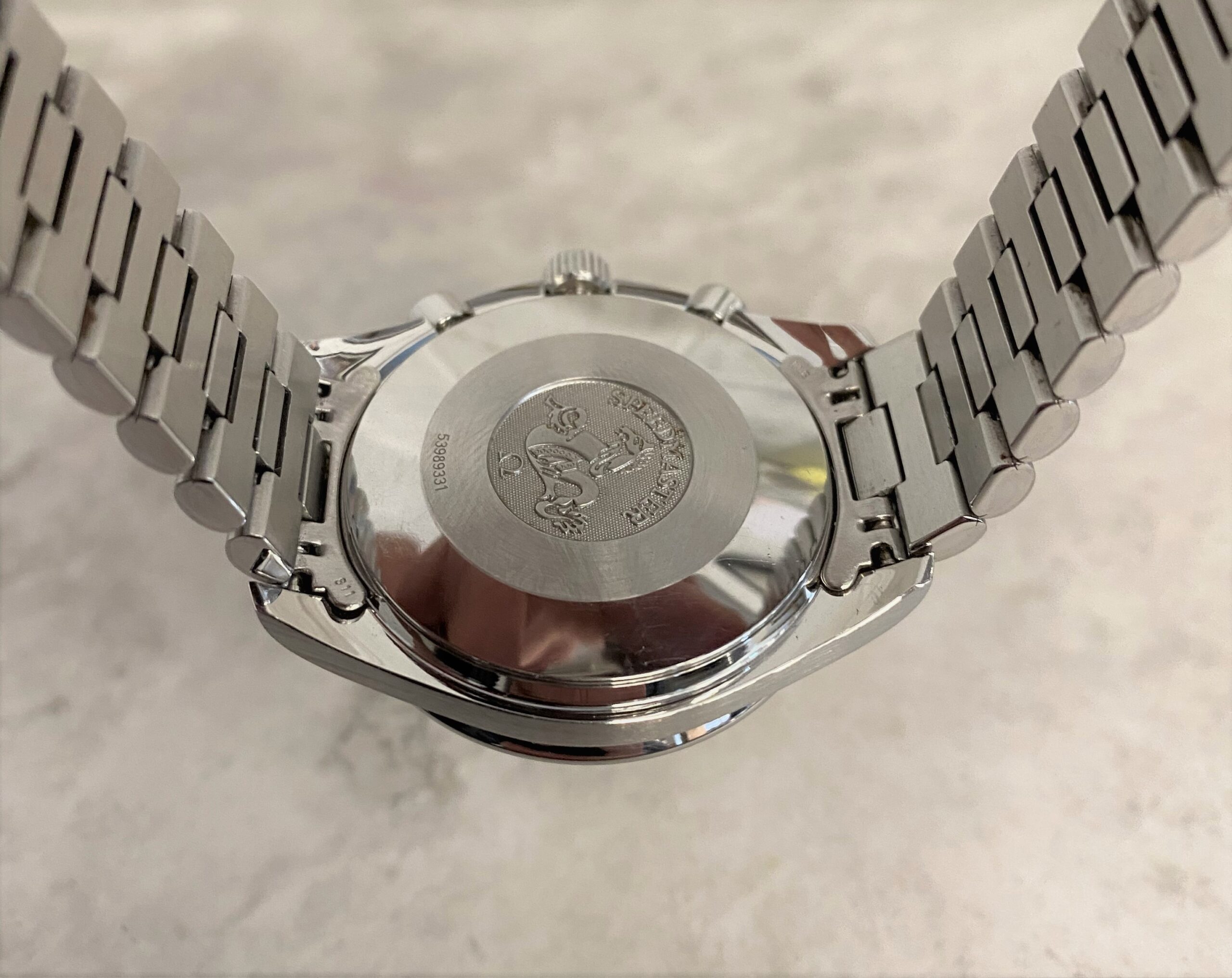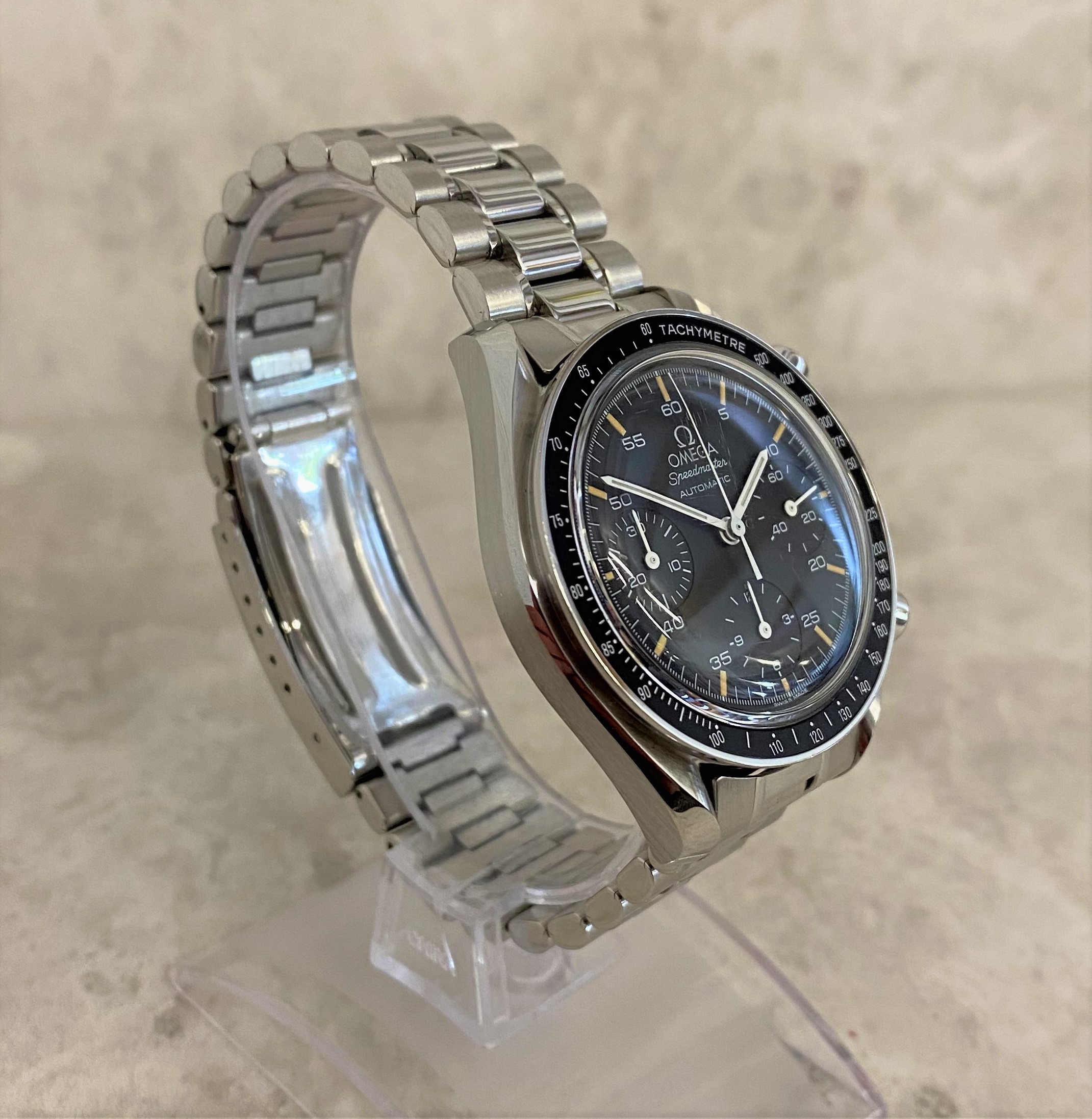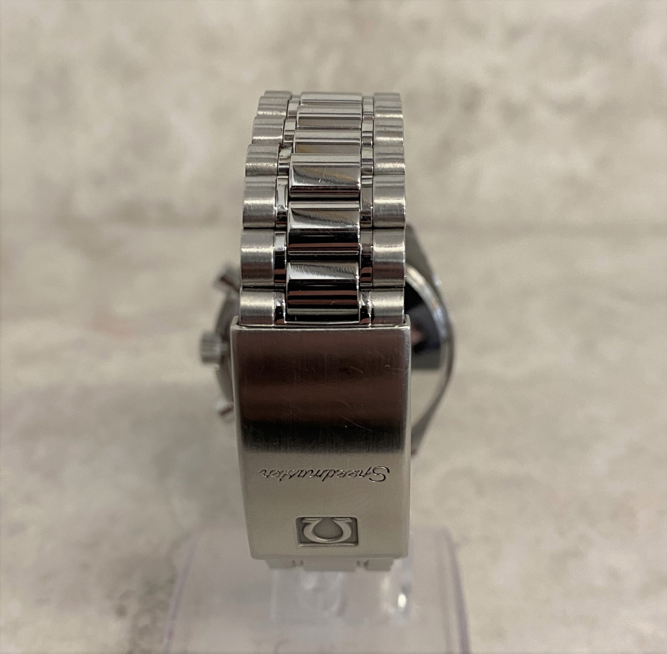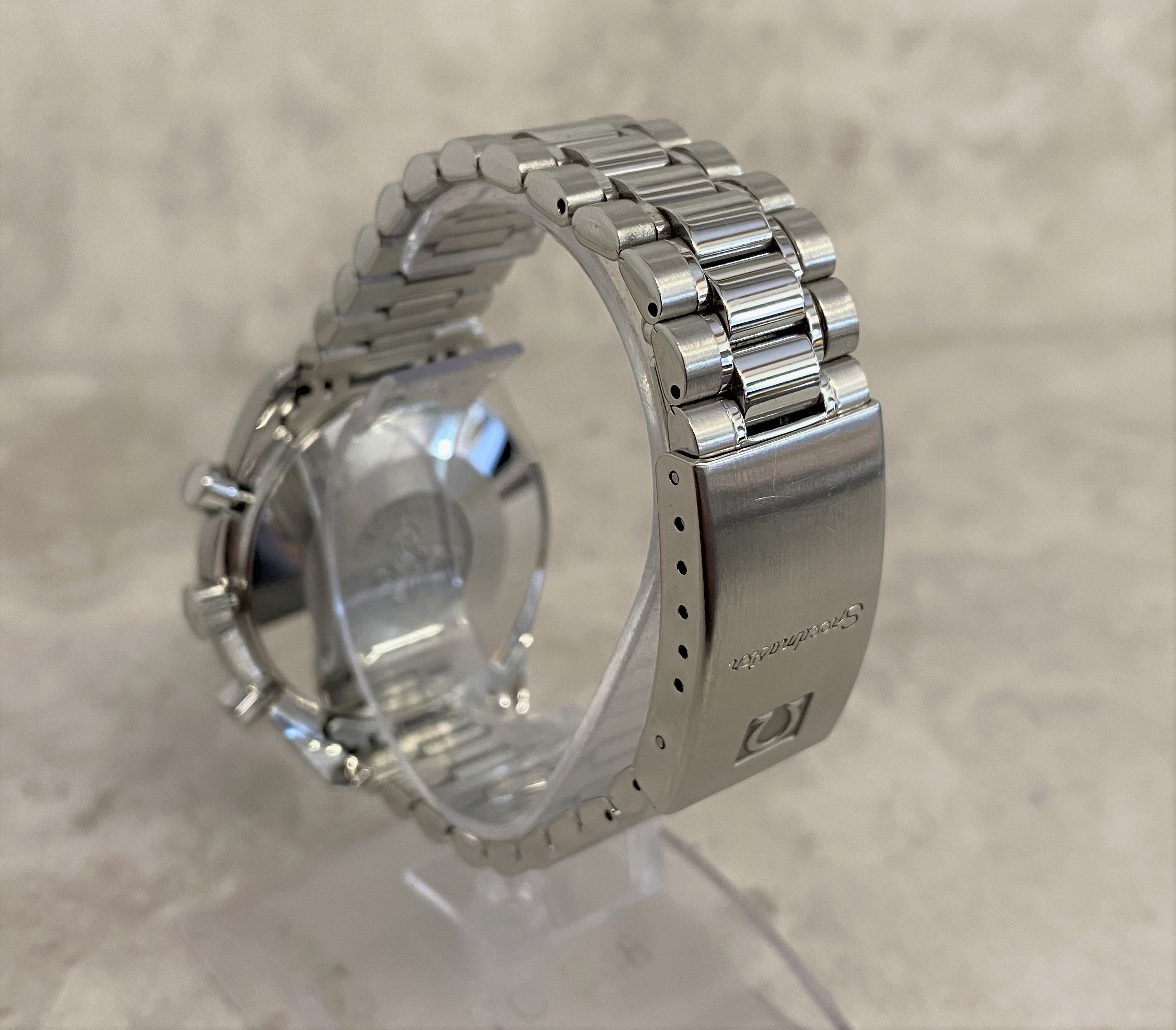 Omega calibre 3220 automatic movement, lever escapement, 47 jewels, mono-metallic balance, 28,800 BPH, Incabloc shock absorber [D] black dial, luminescent baton hour indexes with, Arabic 5-minute markers, outer white track for minutes & chronograph seconds, three subsidiary dials for constant seconds, 30-minute and 12-hour registers, luminescent baton hands, central chronograph seconds hand [C] stainless steel case with polished and satin finished flared lugs, black bezel calibrated for tachymeter, round chronograph pushers, press-in case back centre with embossed Speedmaster logo, Omega crown, Omega signed plexi-glass [B] detachable stainless steel bracelet with polished central links and satin finished side links, satin finished folding clasp [S] case, dial, movement, crown, crystal and bracelet signed.