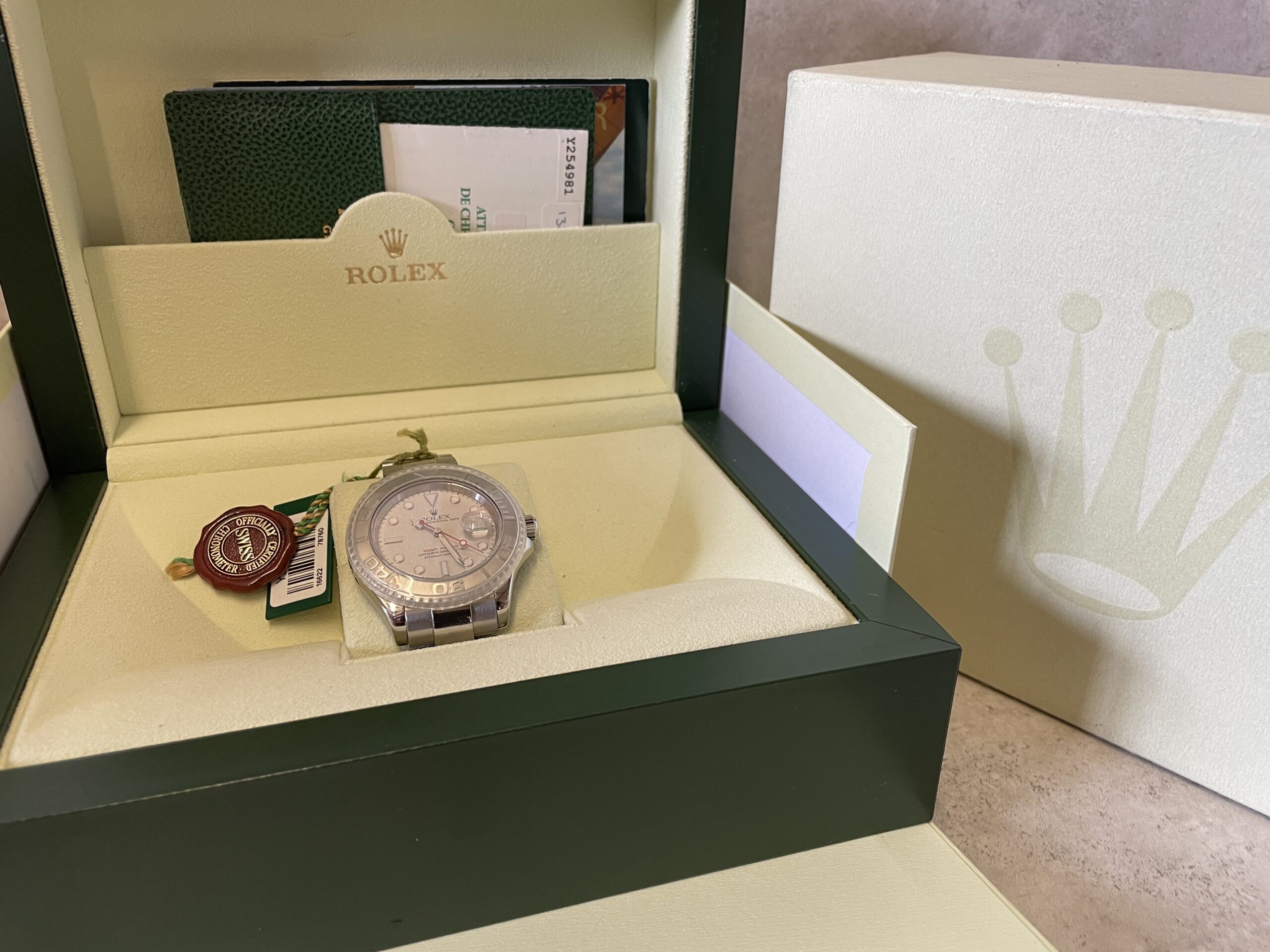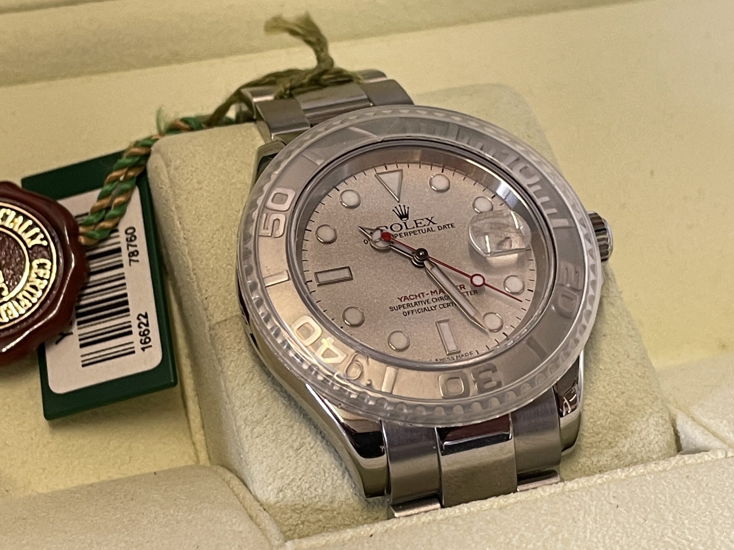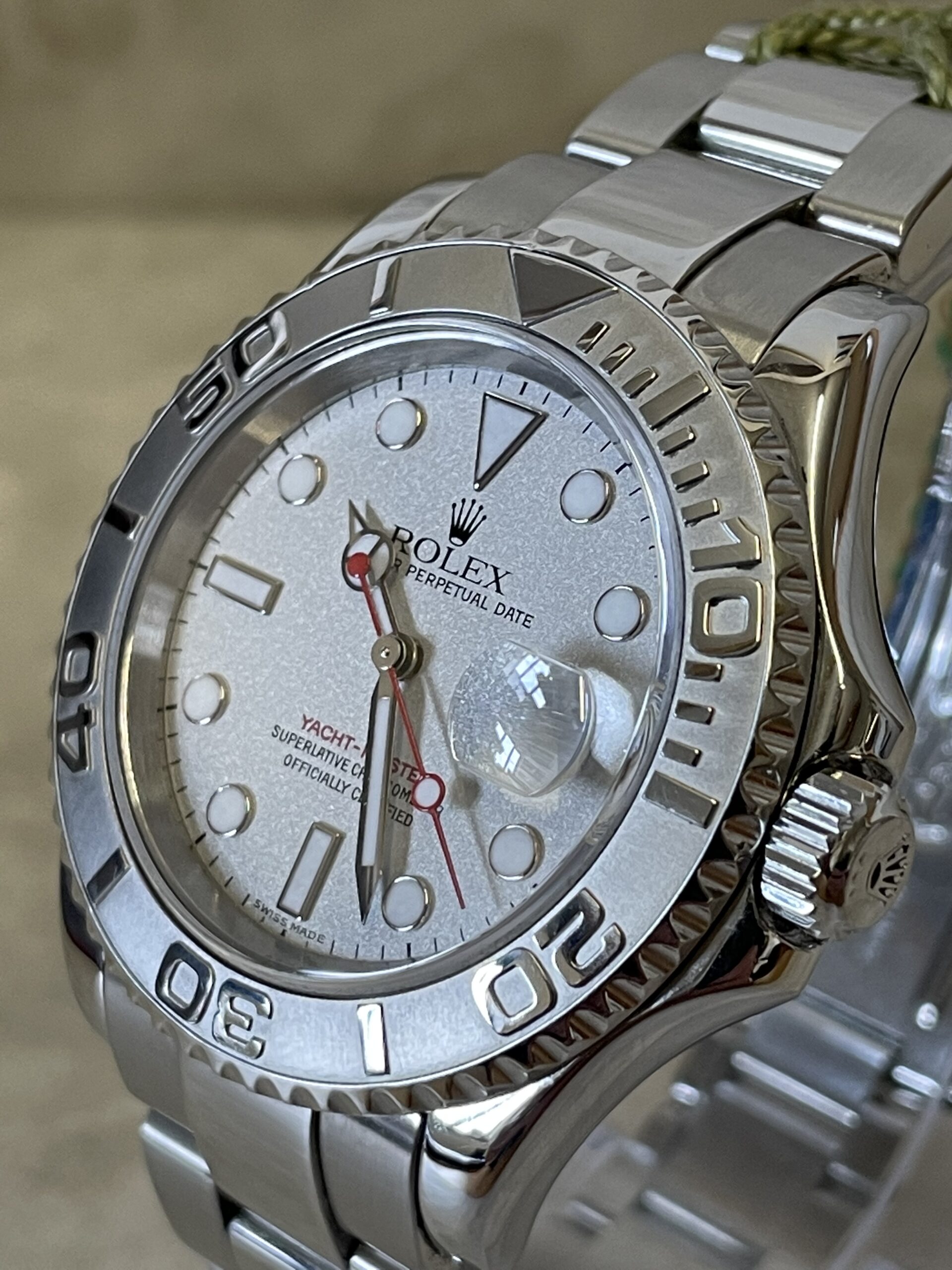 On the dial, a Maxi-style configuration is featured, complete with a white date aperture with a “Cyclops” magnifying lens, large hands and hour markers crafted from white gold, and some distinct color accenting unique to the Yacht-Master collection. Inside, the 16622 features the Rolex caliber 3135, an automatic movement with a 48-hour power reserve, an incredibly reliable, chronometer-grade movement used extensively by the brand.