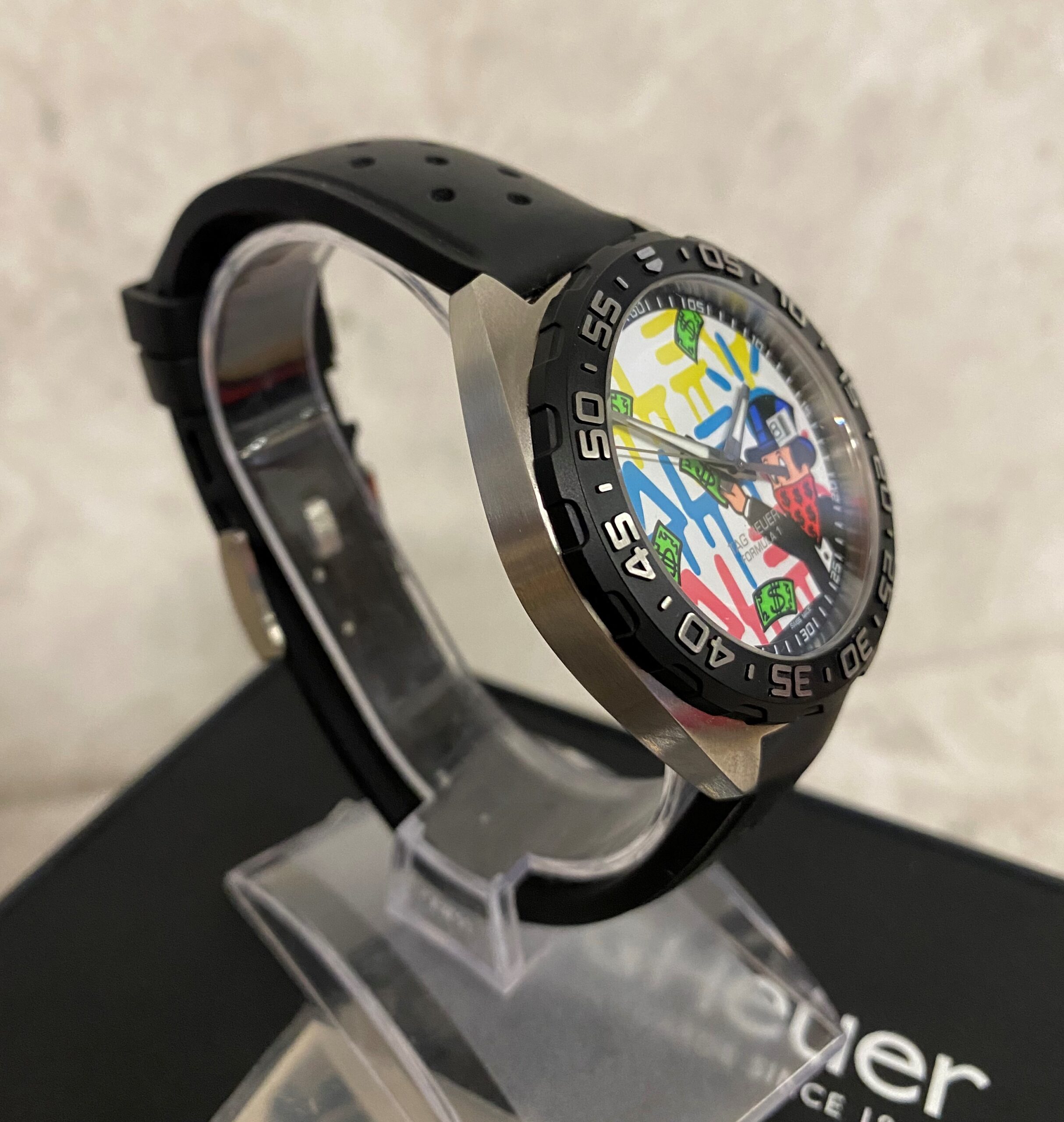 Honouring American street artist Alec Monopoly and his colourful signature derived from the Monopoly board game’s Rich Uncle Pennybags, this TAG Heuer Formula 1 Alec Monopoly watch combines the beauty of his art with an exquisite Swiss made quartz movement. Remaining true to their avant-garde identity, TAG Heuer have incorporated one of the most reliable and accurate quartz movements made in Switzerland which has a variation of only a few seconds per month with a bold and colourful dial exhibiting examples of Alec Monopoly’s own work.